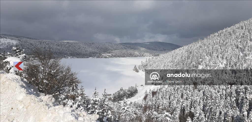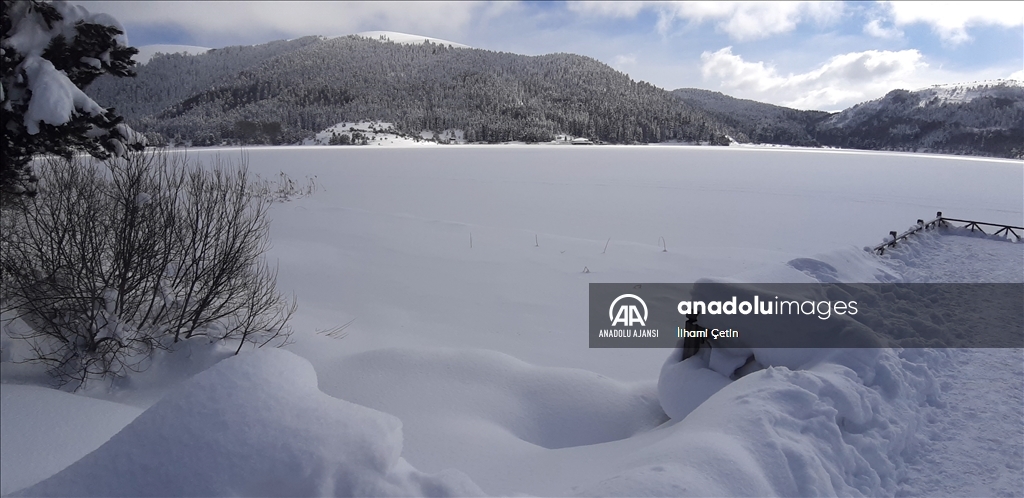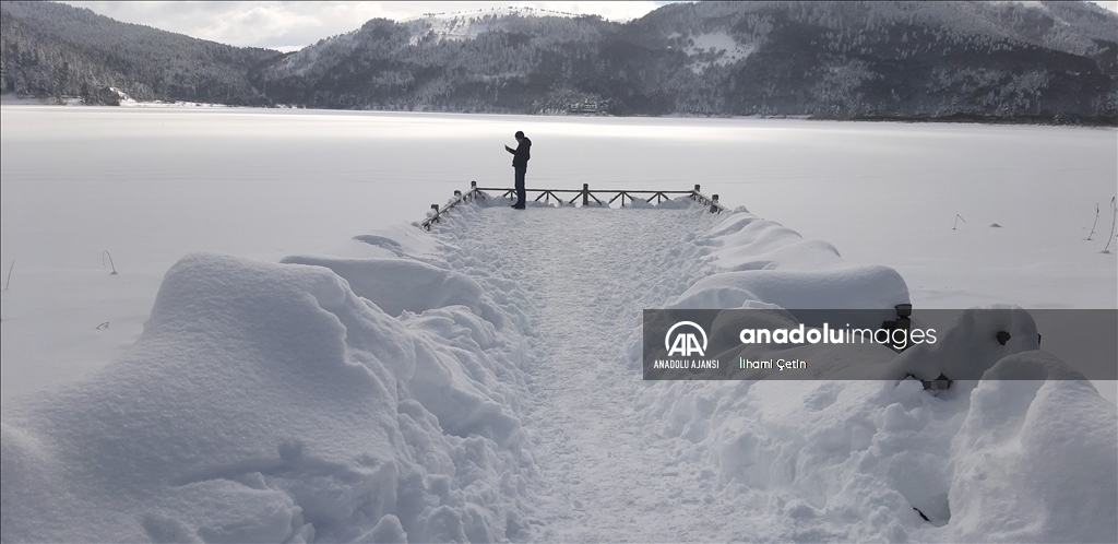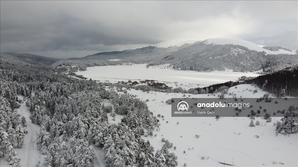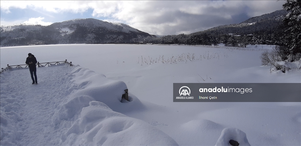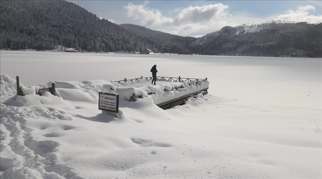 Bolu'nun doğal güzellikleriyle ünlü Abant Tabiat Parkı'ndaki gölün yüzeyi buzla kaplandı.