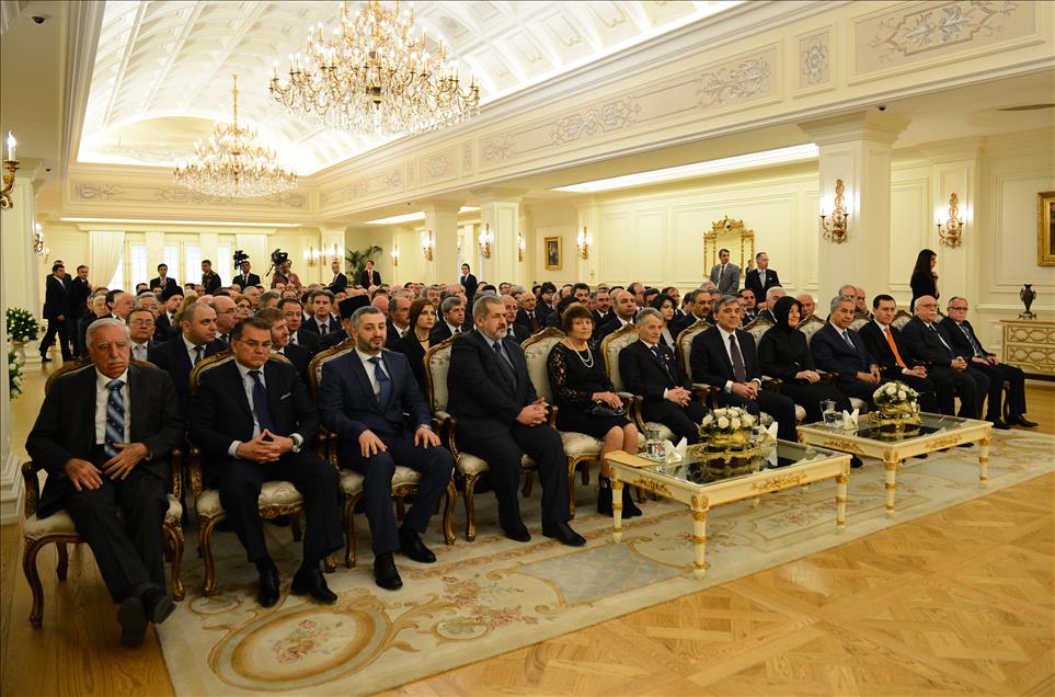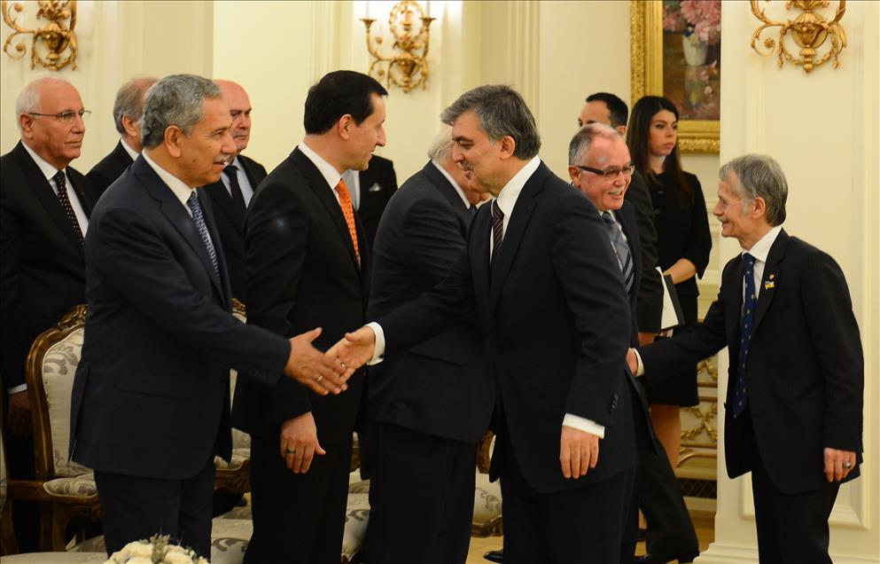 Kırım Tatar Türkleri lideri Mustafa Abdülcemil Kırımoğlu'na Cumhuriyet Nişanı tevcih töreni, Cumhurbaşkanı Abdullah Gül’ün katılımıyla Çankaya Köşkü’nde gerçekleştirildi. Cumhurbaşkanı Gül ve Kırımoğlu konuklarla tokalaştı. Törene Başbakan Yardımcıları Bülent Arınç (sol) ve Emrullah İşler de (sol2) katıldı. (Halil Sağırkaya - Anadolu Ajansı)Halil Sağırkaya