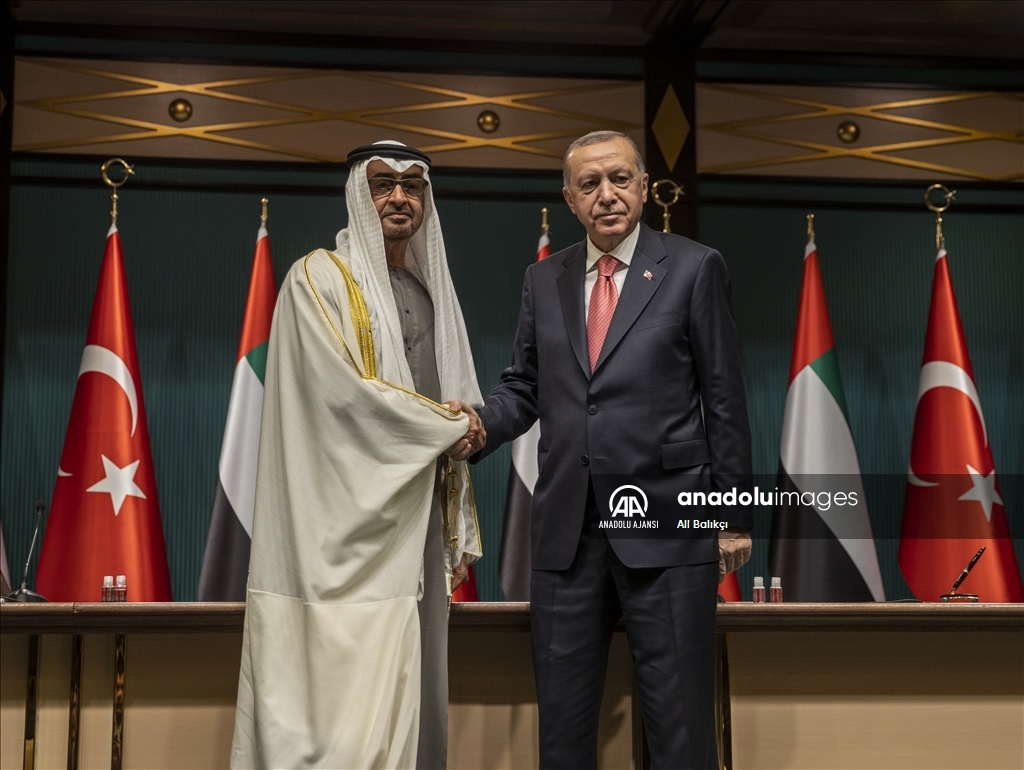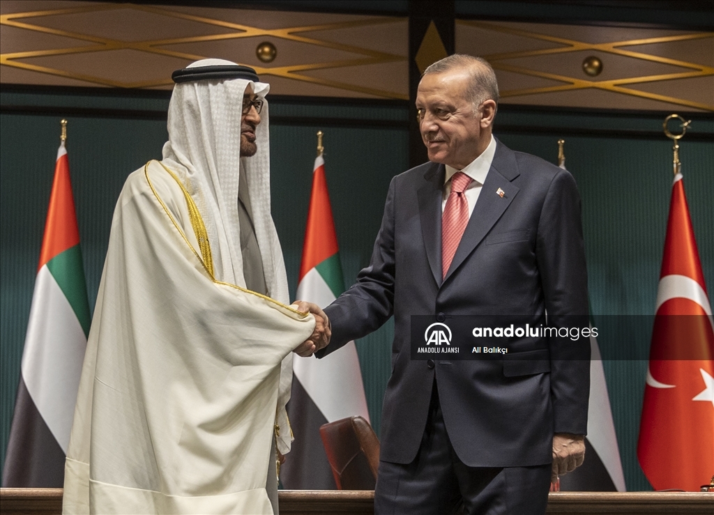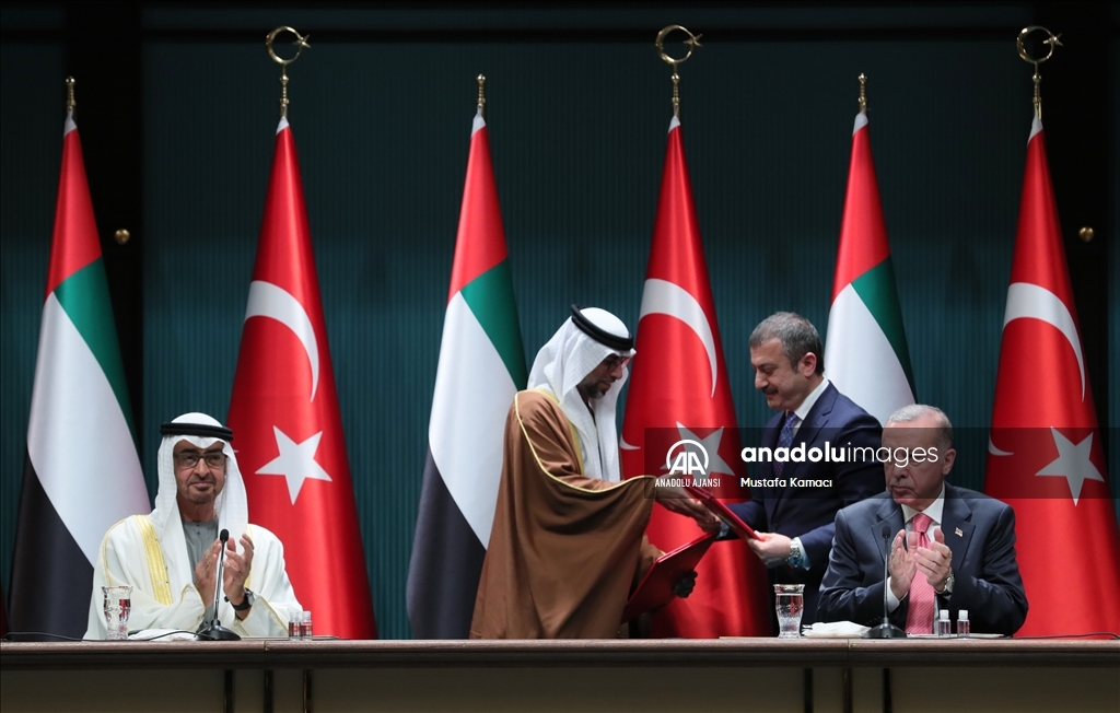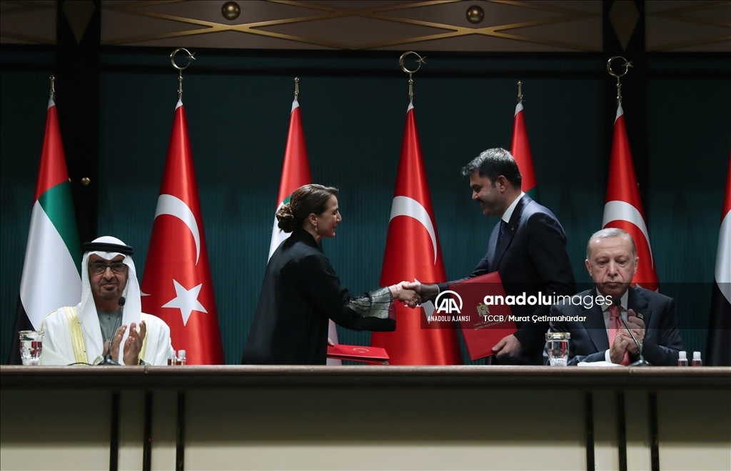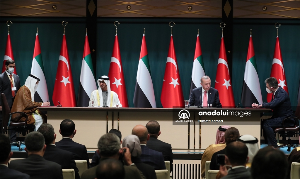 Cumhurbaşkanı Recep Tayyip Erdoğan, Türkiye'ye resmi ziyarette bulunan Abu Dabi Veliaht Prensi Şeyh Muhammed bin Zayed Al Nahyan ile Cumhurbaşkanlığı Külliyesi’nde bir araya geldi. Baş başa ve heyetler arası görüşmelerin ardından Cumhurbaşkanı Erdoğan ve Abu Dabi Veliaht Prensi bin Zayed'in nezaretinde iki ülke arasında anlaşmalar imzalandı. ( TCCB/Murat Çetinmühürdar - Anadolu Ajansı )TCCB/Murat Çetinmühürdar