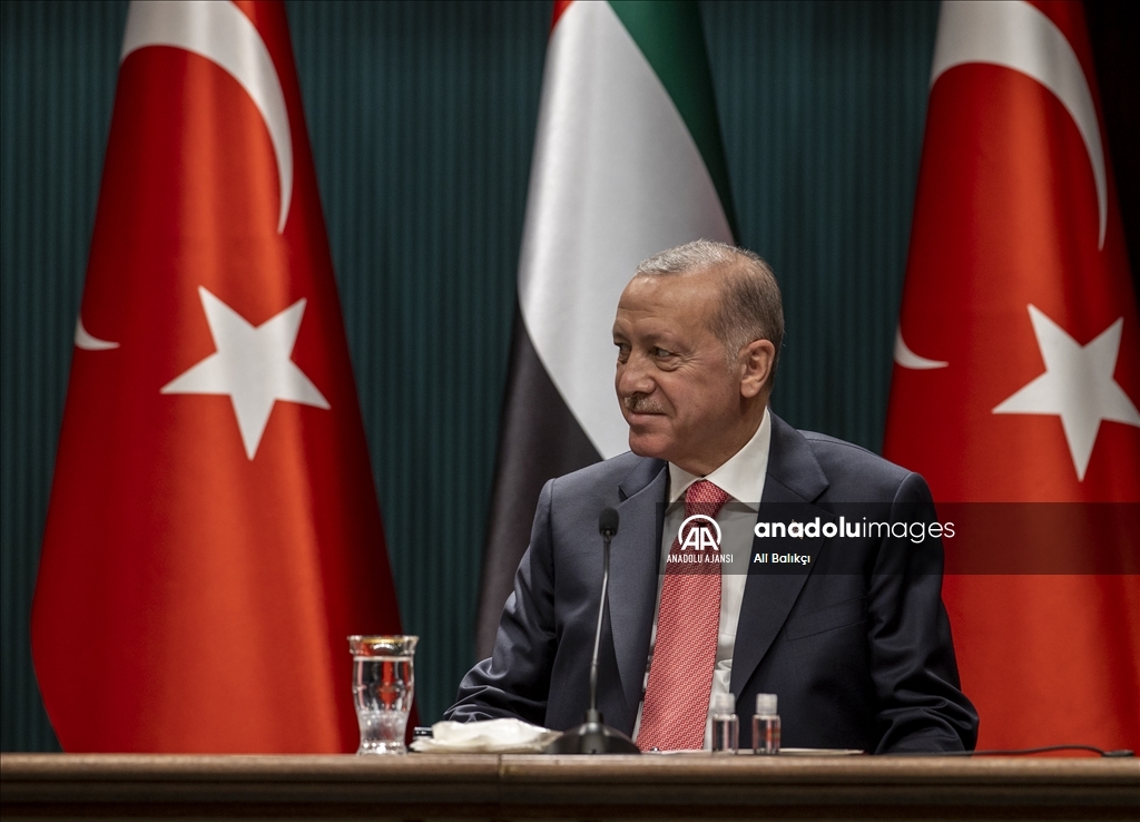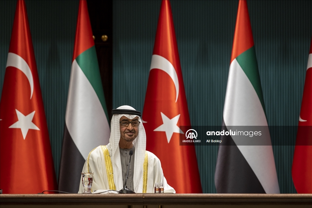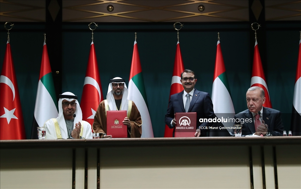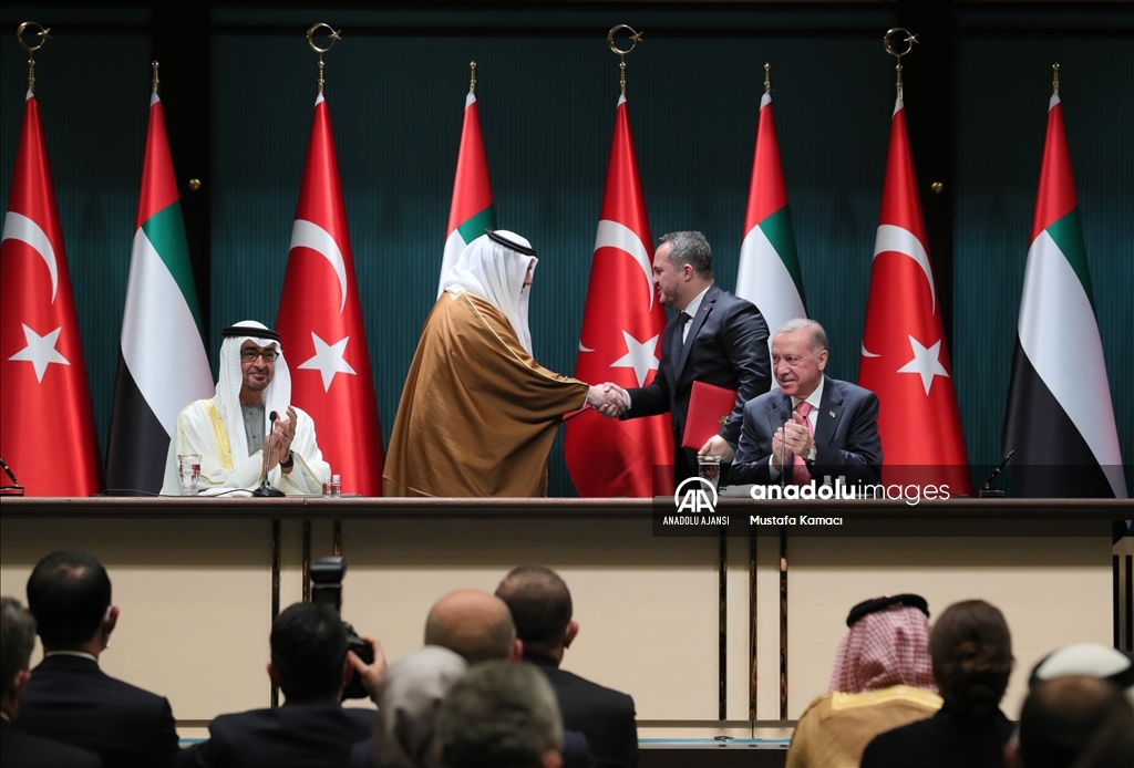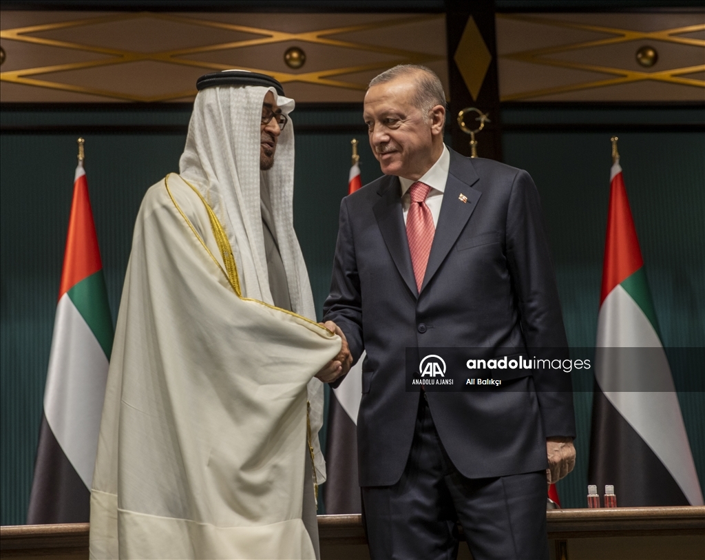 Cumhurbaşkanı Recep Tayyip Erdoğan, Türkiye'ye resmi ziyarette bulunan Abu Dabi Veliaht Prensi Şeyh Muhammed bin Zayed Al Nahyan ile Cumhurbaşkanlığı Külliyesi’nde bir araya geldi. Baş başa ve heyetler arası görüşmelerin ardından Cumhurbaşkanı Erdoğan ve Abu Dabi Veliaht Prensi bin Zayed'in nezaretinde iki ülke arasında anlaşmalar imzalandı. ( TCCB/Murat Çetinmühürdar - Anadolu Ajansı )TCCB/Murat Çetinmühürdar