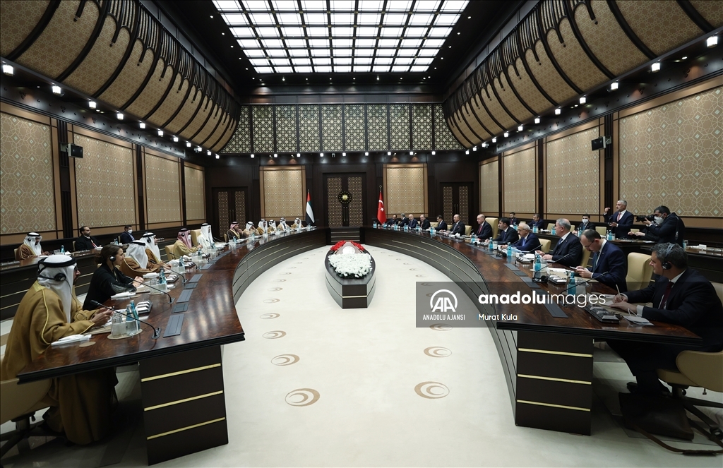 Cumhurbaşkanı Recep Tayyip Erdoğan, Türkiye'ye resmi ziyarette bulunan Abu Dabi Veliaht Prensi Şeyh Muhammed bin Zayid Al Nahyan ile Cumhurbaşkanlığı Külliyesi’nde bir araya geldi. ( TCCB/Murat Çetinmühürdar - Anadolu Ajansı )TCCB/Murat Çetinmühürdar