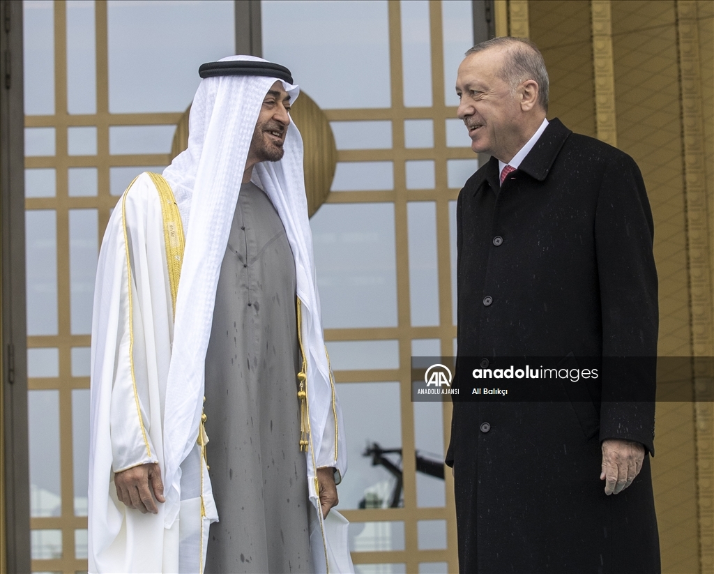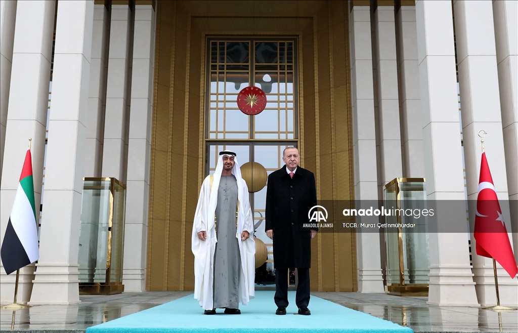 Cumhurbaşkanı Recep Tayyip Erdoğan, Türkiye'ye resmi ziyarette bulunan Abu Dabi Veliaht Prensi Şeyh Muhammed bin Zayid Al Nahyan'ı Cumhurbaşkanlığı Külliyesi’nde resmi törenle karşıladı. ( TCCB/Murat Çetinmühürdar - Anadolu Ajansı )TCCB/Murat Çetinmühürdar