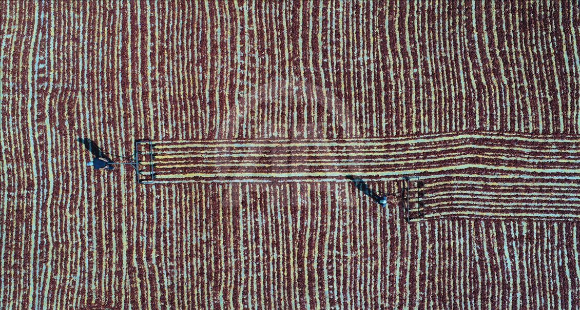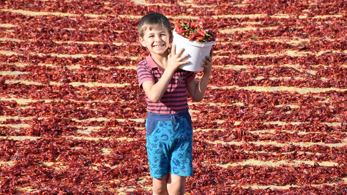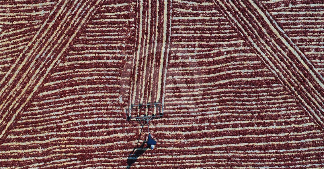 Gaziantep'in İslahiye ilçesinde tarlalardan toplanarak işleme tesislerine getirilen kırmızı biberler, işçilerin acılı elleri ile güneşin kavurucu sıcağından geçtikten sonra yemeklerin vazgeçilmezi pul bibere dönüşüyor.
