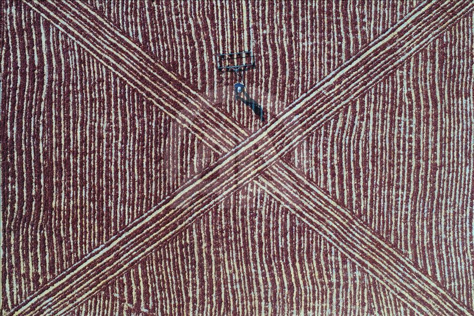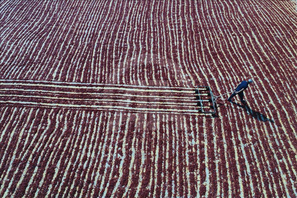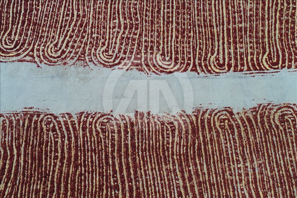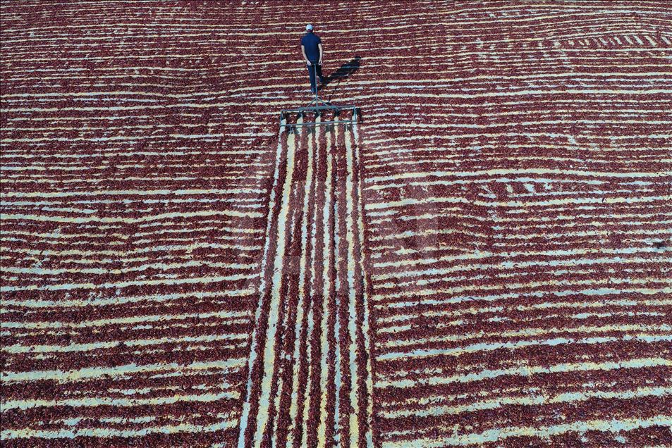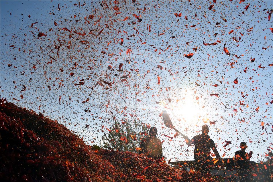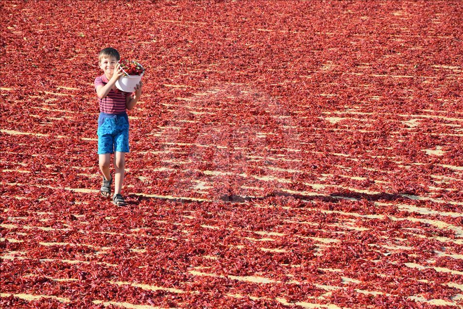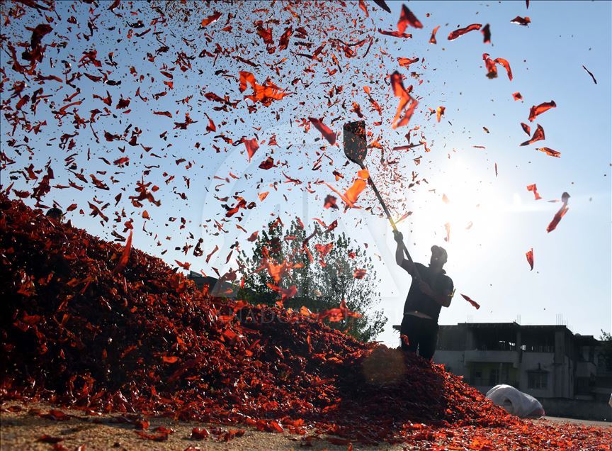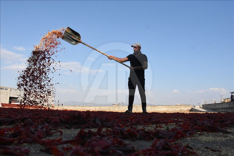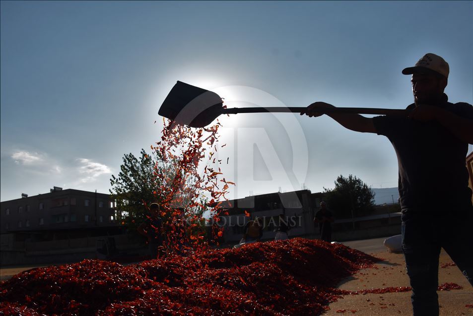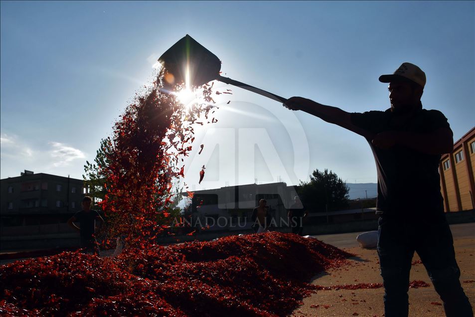 Gaziantep'in İslahiye ilçesinde tarlalardan toplanarak işleme tesislerine getirilen kırmızı biberler, işçilerin acılı elleri ile güneşin kavurucu sıcağından geçtikten sonra yemeklerin vazgeçilmezi pul bibere dönüşüyor. ( Mehmet Akif Parlak - Anadolu Ajansı )Mehmet Akif Parlak
