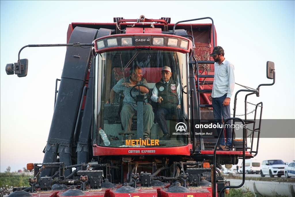 Adana'nın Karataş ilçesi Yemişli Mahallesi'ndeki pamuk tarlasında hasat etkinliği düzenlendi. Programa katılan Tarım ve Orman Bakanı Vahit Kirişci (solda), biçerdöverle pamuk hasadı yaptı. ( Serkan Avci - Anadolu Ajansı )Serkan Avci