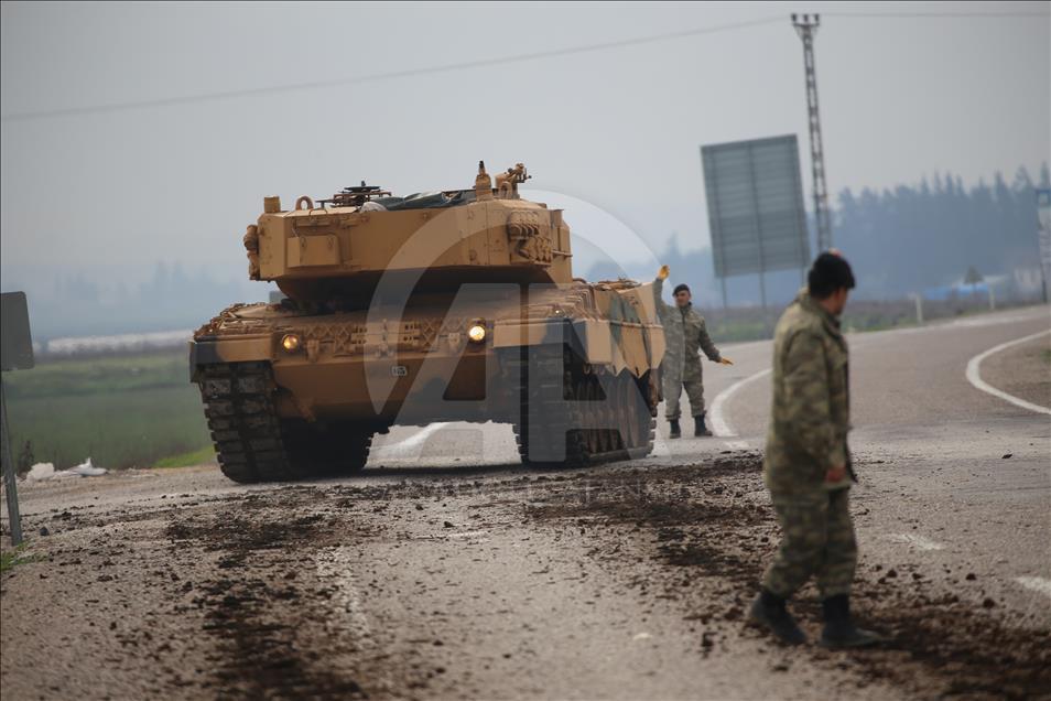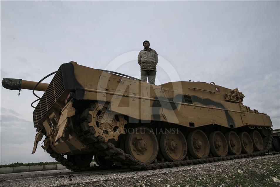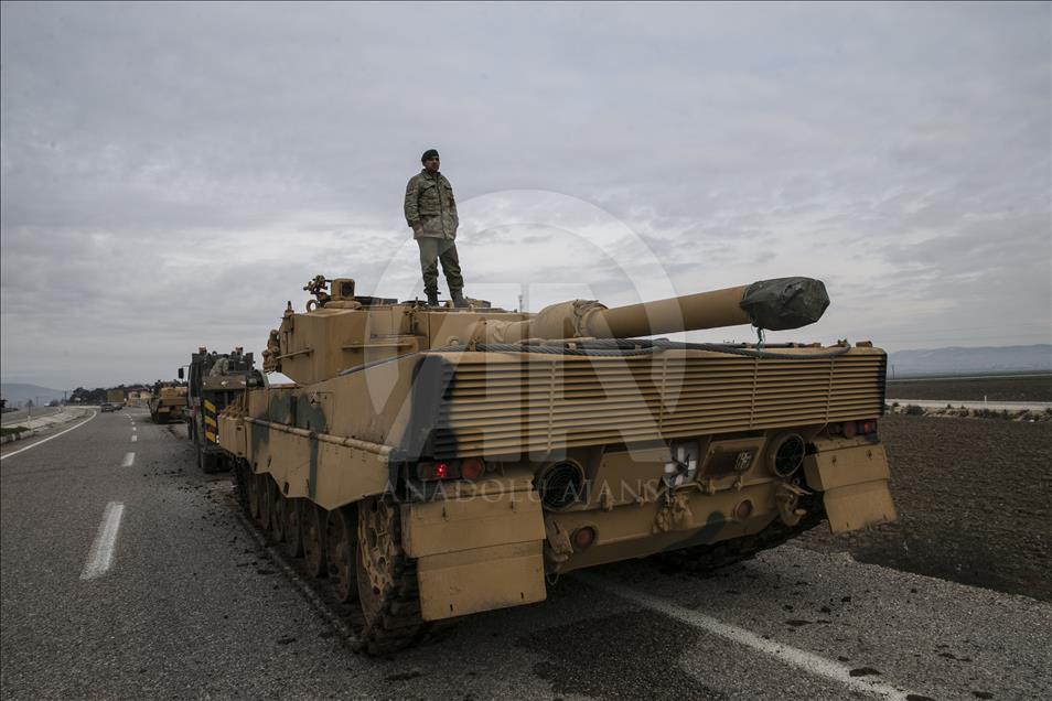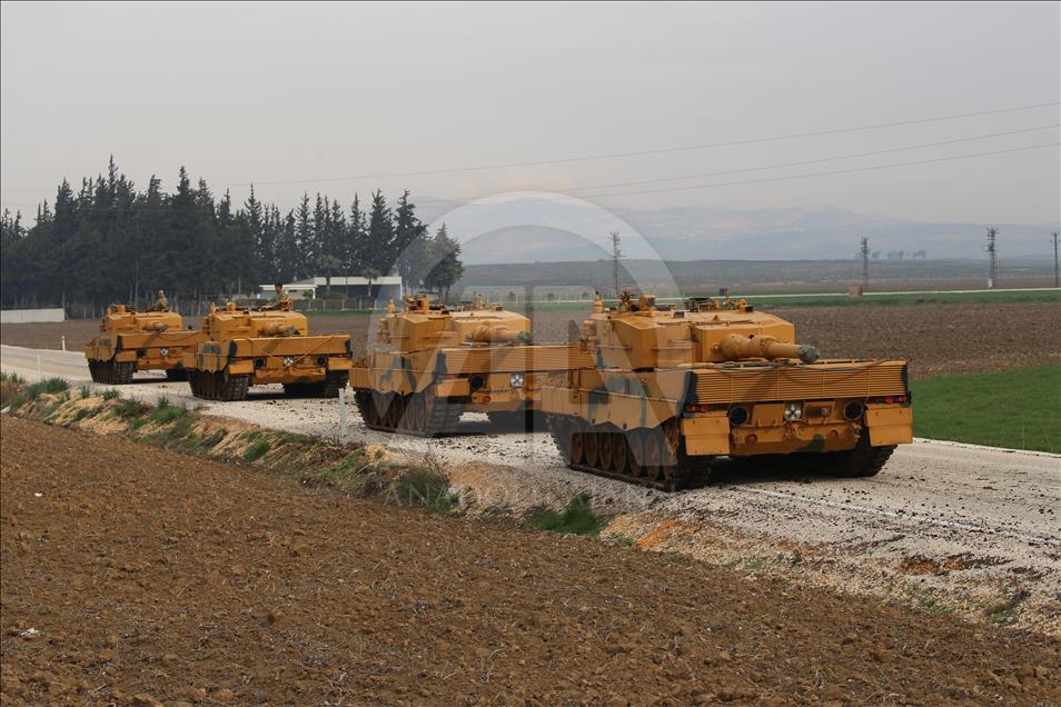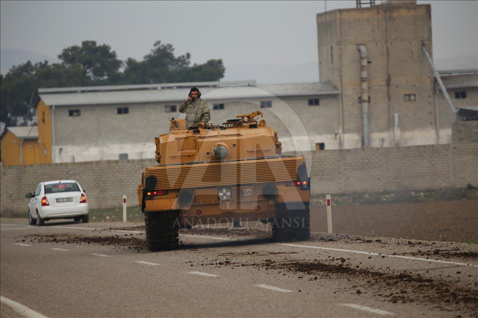 Türk Silahlı Kuvvetlerinin (TSK), Suriye'nin Afrin bölgesinde terör örgütü PYD/PKK tarafından işgal edilen alanlara yönelik dün başlattığı Zeytin Dalı Harekatı kapsamında askeri birliklere takviye olarak gönderilen obüs ve tanklar Hatay'daki sınır birliklerine konuşlandırıldı. ( Cem Genco - Anadolu Ajansı )Cem Genco