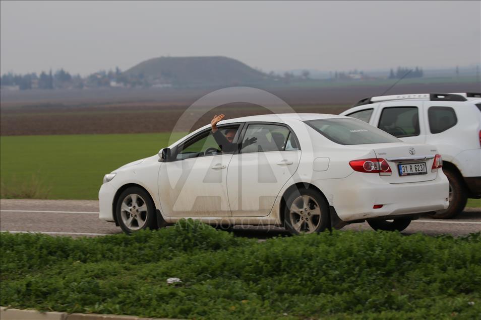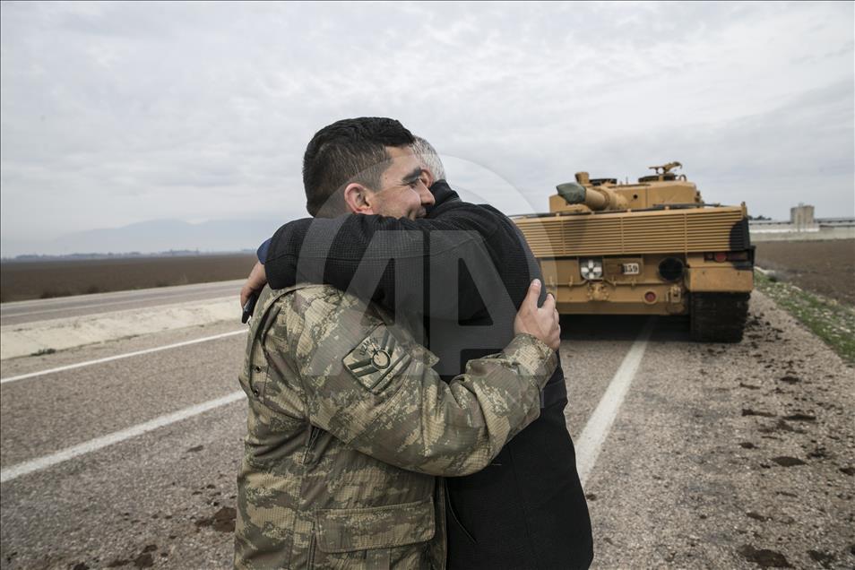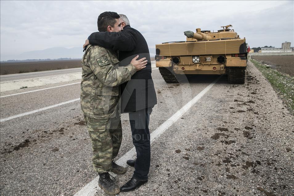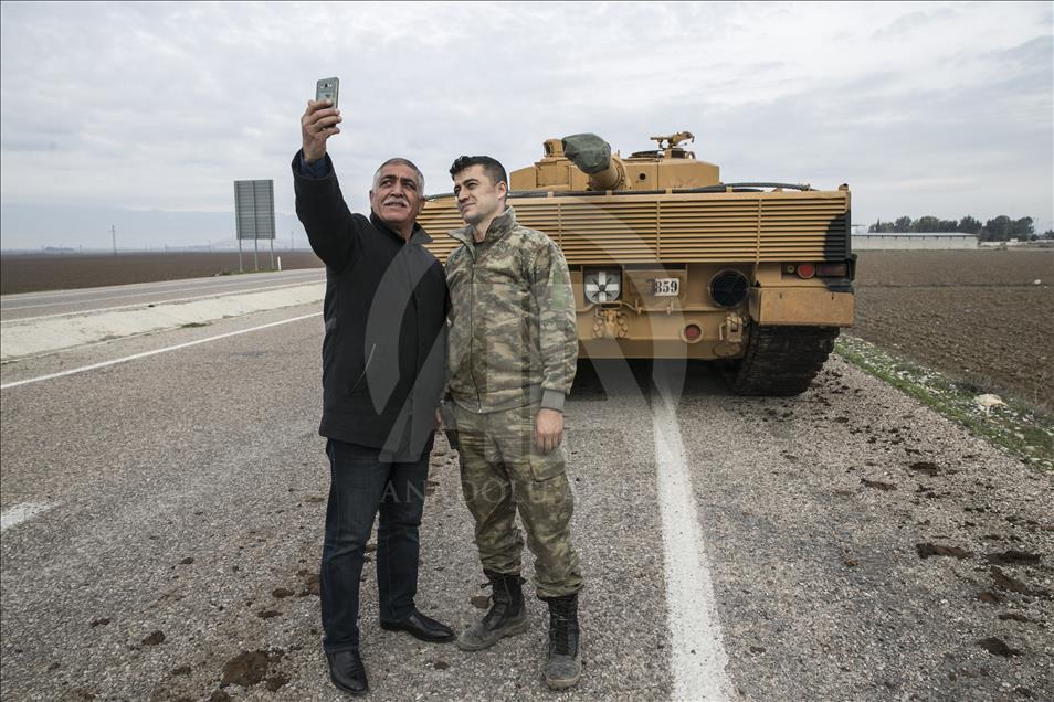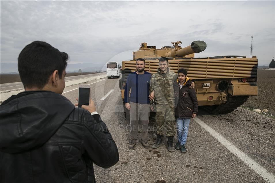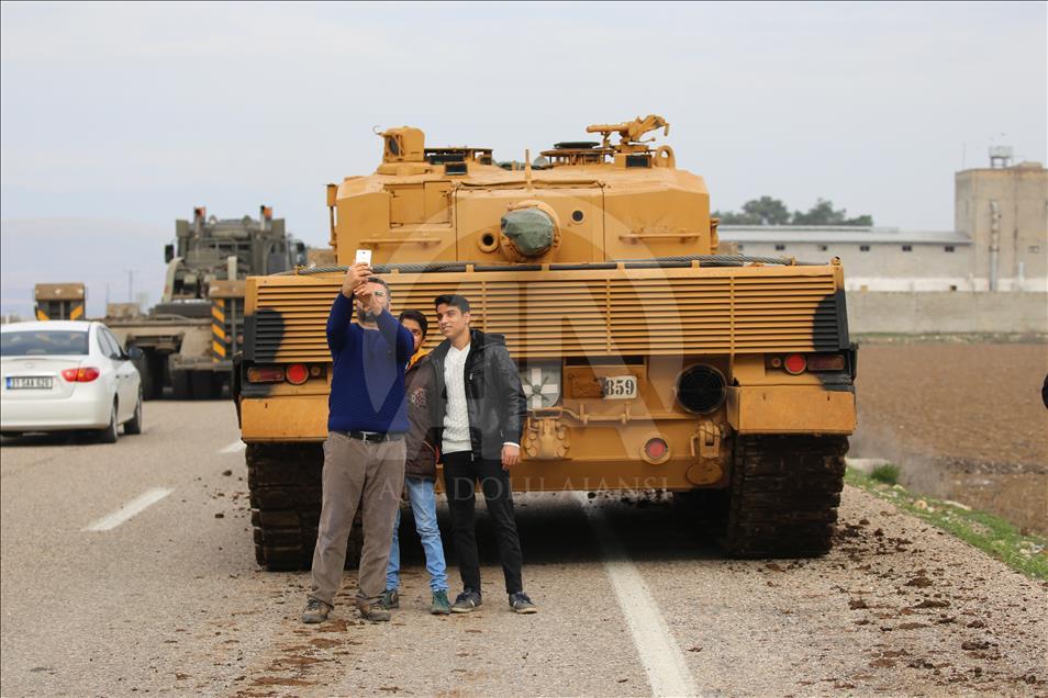 Türk Silahlı Kuvvetlerinin (TSK), Suriye'nin Afrin bölgesinde terör örgütü PYD/PKK tarafından işgal edilen alanlara yönelik dün başlattığı Zeytin Dalı Harekatı kapsamında askeri birliklere takviye olarak gönderilen obüs ve tanklar Hatay'daki sınır birliklerine konuşlandırıldı. Vatandaşlar, görevli personele sevgi gösterisinde bulundu ve fotoğraf çektirdi. ( Cem Genco - Anadolu Ajansı )Cem Genco