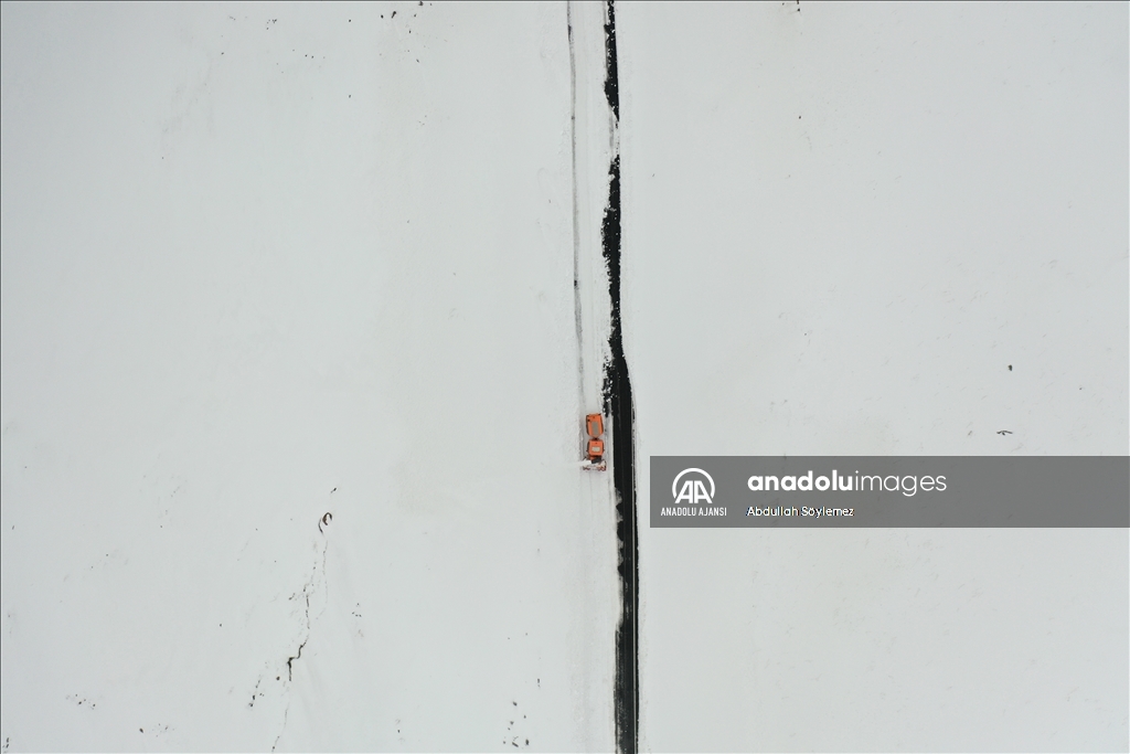 Ağrı'da Karayolları ekipleri, karlı yolları açık tutmak için gece gündüz dondurucu soğukta mesai yapıyor. Karla mücadele çalışmaları havadan görüntülendi. ( Abdullah Söylemez - Anadolu Ajansı )Abdullah Söylemez