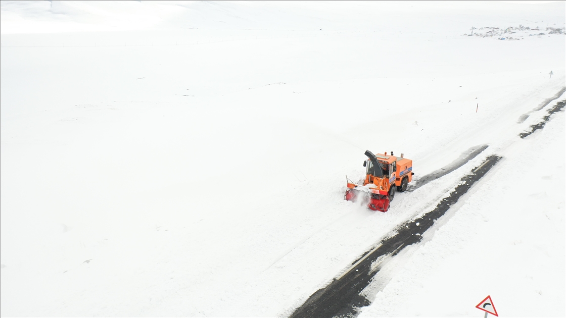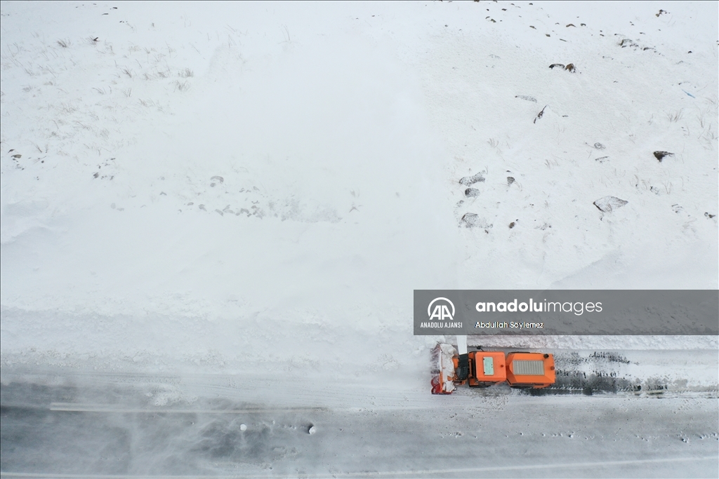 Ağrı'da Karayolları ekipleri, karlı yolları açık tutmak için gece gündüz dondurucu soğukta mesai yapıyor. Karla mücadele çalışmaları havadan görüntülendi.