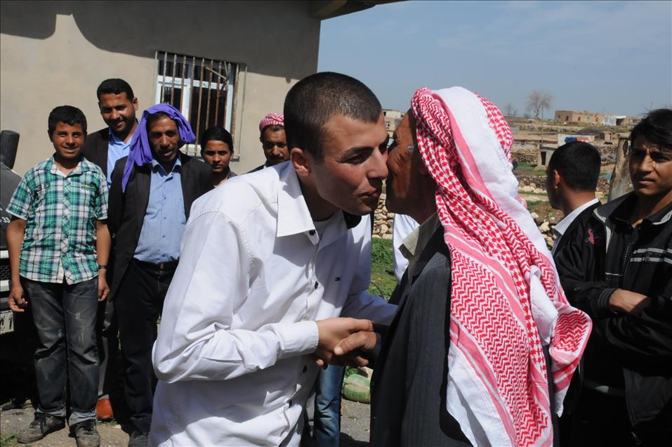 TEROR ORGUTU PKK TARAFINDAN KACIRILDIKTAN SONRA IRAK'A GIDEN HEYET TARAFINDAN TESLIM ALINARAK TURKIYE'YE GETIRILEN 8 KAMU GOREVLISINDEN MARDINLI ER RAMAZAN BASRAN DERIK ILCESINE BAGLI DERINSU KOYUNDEKI BABA OCAGINA GELDI. RAMAZAN BASARAN'IN ABISI MEHMET BASARAN EN SON KARDESINI 8 AY ONCE GORDUGUNU, BU SURENIN KENDILERI ICIN COK ZOR GECTIGINI BELIRTTI. (ANADOLU AJANSI - IBRAHIM SINCAR) (20130314)
