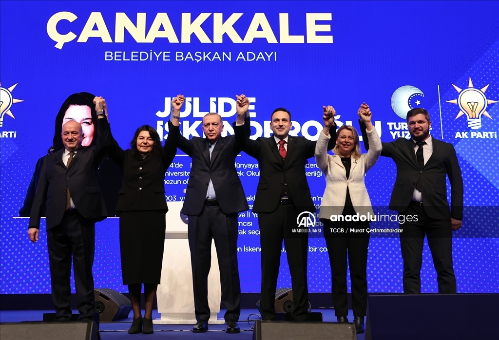 Cumhurbaşkanı ve AK Parti Genel Başkanı Recep Tayyip Erdoğan, Haliç Kongre Merkezi'nde düzenlenen AK Parti Aday Tanıtım Toplantısı'na katıldı. Cumhurbaşkanı Erdoğan, AK Parti'nin Çanakkale Belediye Başkan Adayı olarak açıkladığı Jülide İskenderoğlu'nu sahneye davet ederek partilileri selamladı. ( TCCB / Murat Çetinmühürdar - Anadolu Ajansı )TCCB / Murat Çetinmühürdar
