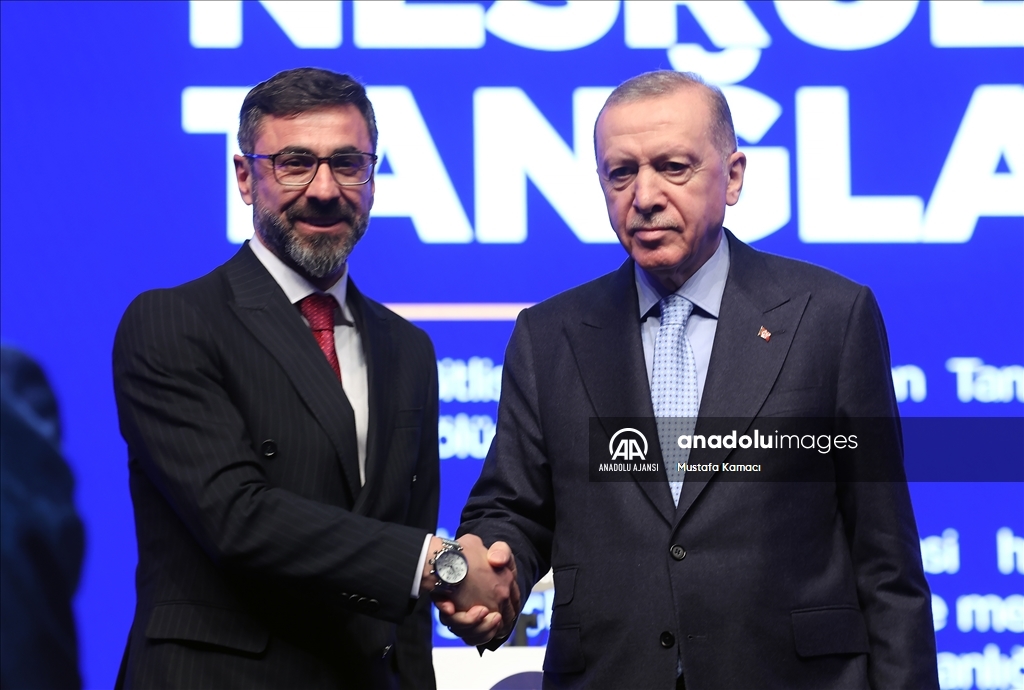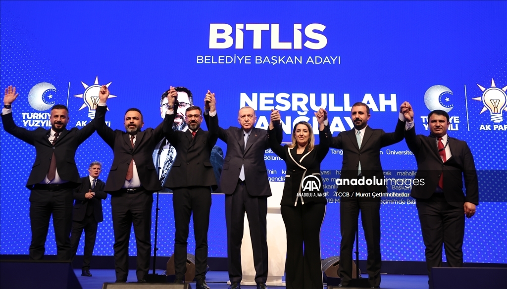 Cumhurbaşkanı ve AK Parti Genel Başkanı Recep Tayyip Erdoğan, Haliç Kongre Merkezi'nde düzenlenen AK Parti Aday Tanıtım Toplantısı'na katıldı. Cumhurbaşkanı Erdoğan, AK Parti'nin Bitlis Belediye Başkan Adayı olarak açıkladığı Nesrullah Tanğlay'ı sahneye davet ederek partilileri selamladı. ( TCCB / Murat Çetinmühürdar - Anadolu Ajansı )TCCB / Murat Çetinmühürdar