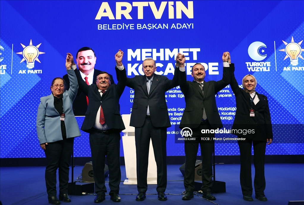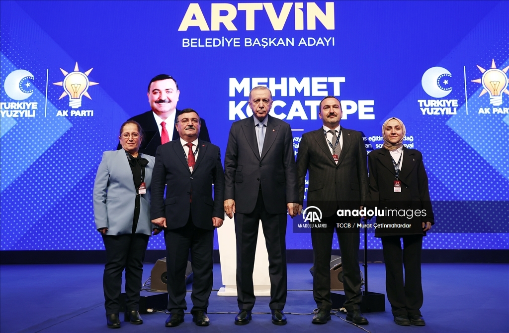 Cumhurbaşkanı ve AK Parti Genel Başkanı Recep Tayyip Erdoğan, Haliç Kongre Merkezi'nde düzenlenen AK Parti Aday Tanıtım Toplantısı'na katıldı. Cumhurbaşkanı Erdoğan, AK Parti'nin Artvin Belediye Başkan Adayı olarak açıkladığı Mehmet Kocatepe'yi sahneye davet ederek partilileri selamladı. ( TCCB / Murat Çetinmühürdar - Anadolu Ajansı )TCCB / Murat Çetinmühürdar
