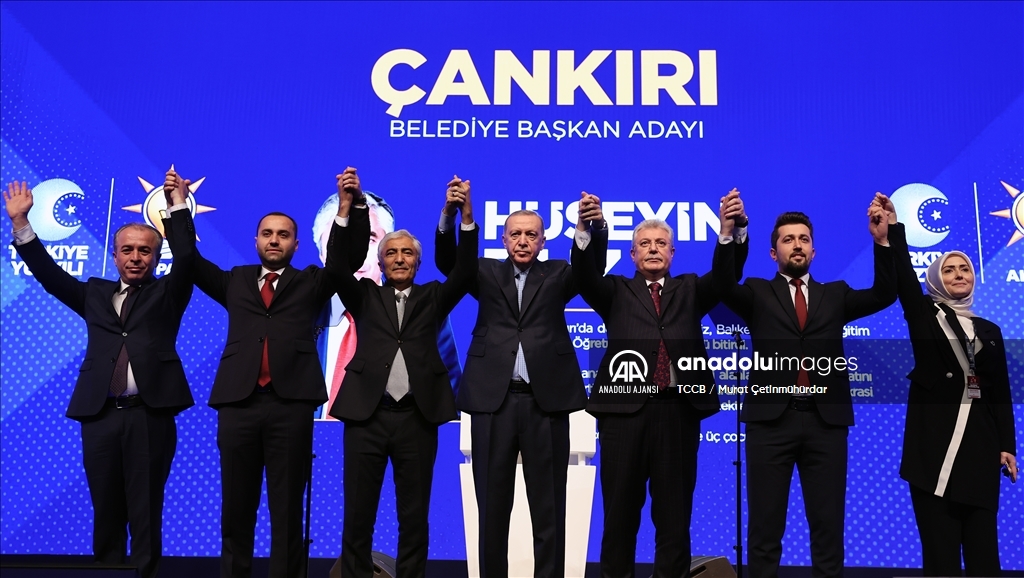 Cumhurbaşkanı ve AK Parti Genel Başkanı Recep Tayyip Erdoğan, Haliç Kongre Merkezi'nde düzenlenen AK Parti Aday Tanıtım Toplantısı'na katıldı. Cumhurbaşkanı Erdoğan, AK Parti'nin Çankırı Belediye Başkan Adayı olarak açıkladığı Hüseyin Filiz'i sahneye davet ederek partilileri selamladı. ( TCCB / Murat Çetinmühürdar - Anadolu Ajansı )TCCB / Murat Çetinmühürdar