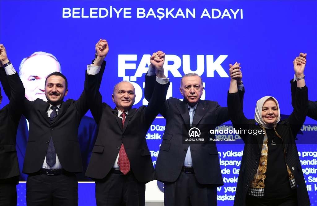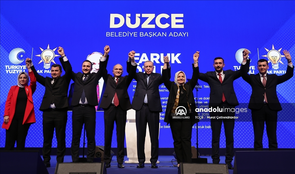 Cumhurbaşkanı ve AK Parti Genel Başkanı Recep Tayyip Erdoğan, Haliç Kongre Merkezi'nde düzenlenen AK Parti Aday Tanıtım Toplantısı'na katıldı. Cumhurbaşkanı Erdoğan, AK Parti'nin Düzce Belediye Başkan Adayı olarak açıkladığı Faruk Özlü'yü sahneye davet ederek partilileri selamladı. ( TCCB / Murat Çetinmühürdar - Anadolu Ajansı )TCCB / Murat Çetinmühürdar