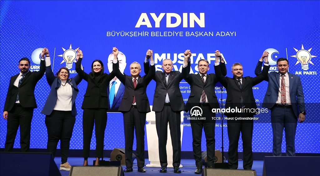 Cumhurbaşkanı ve AK Parti Genel Başkanı Recep Tayyip Erdoğan, Haliç Kongre Merkezi'nde düzenlenen AK Parti Aday Tanıtım Toplantısı'na katıldı. Cumhurbaşkanı Erdoğan, AK Parti'nin Aydın Büyükşehir Belediye Başkan Adayı olarak açıkladığı Mustafa Savaş'ı sahneye davet ederek partilileri selamladı. ( TCCB / Murat Çetinmühürdar - Anadolu Ajansı )TCCB / Murat Çetinmühürdar