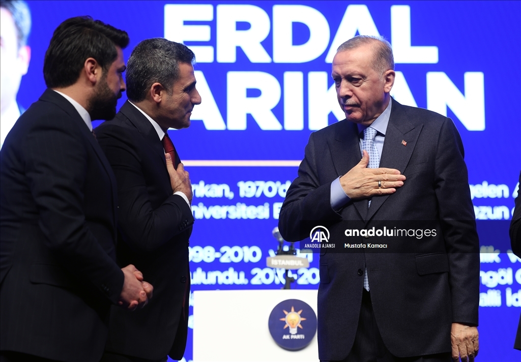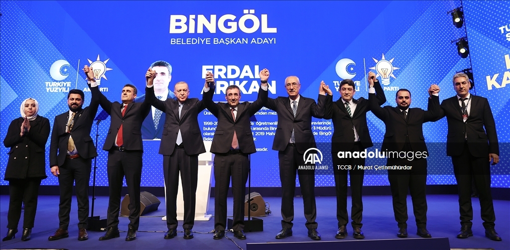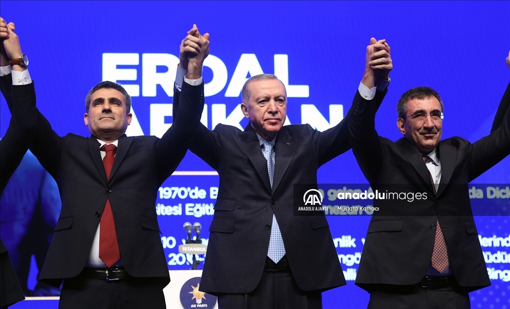 Cumhurbaşkanı ve AK Parti Genel Başkanı Recep Tayyip Erdoğan, Haliç Kongre Merkezi'nde düzenlenen AK Parti Aday Tanıtım Toplantısı'na katıldı. Cumhurbaşkanı Erdoğan, AK Parti'nin Bingöl Belediye Başkan Adayı olarak açıkladığı Erdal Arıkan'ı sahneye davet ederek partilileri selamladı. ( TCCB / Murat Çetinmühürdar - Anadolu Ajansı )TCCB / Murat Çetinmühürdar