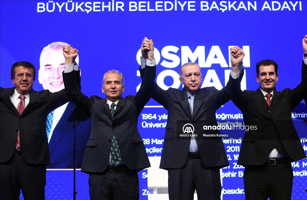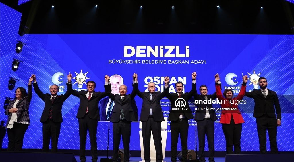 Cumhurbaşkanı ve AK Parti Genel Başkanı Recep Tayyip Erdoğan, Haliç Kongre Merkezi'nde düzenlenen AK Parti Aday Tanıtım Toplantısı'na katıldı. Cumhurbaşkanı Erdoğan, AK Parti'nin Denizli Büyükşehir Belediye Başkan Adayı olarak açıkladığı Osman Zolan'ı sahneye davet ederek partilileri selamladı. ( TCCB / Murat Çetinmühürdar - Anadolu Ajansı )TCCB / Murat Çetinmühürdar