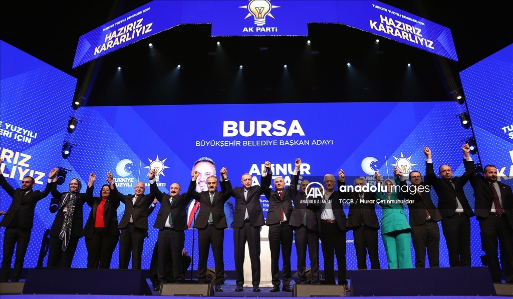 Cumhurbaşkanı ve AK Parti Genel Başkanı Recep Tayyip Erdoğan, Haliç Kongre Merkezi'nde düzenlenen AK Parti Aday Tanıtım Toplantısı'na katıldı. Cumhurbaşkanı Erdoğan, AK Parti'nin Bursa Büyükşehir Belediye Başkan Adayı olarak açıkladığı Alinur Aktaş'ı sahneye davet ederek partilileri selamladı. ( TCCB / Murat Çetinmühürdar - Anadolu Ajansı )TCCB / Murat Çetinmühürdar
