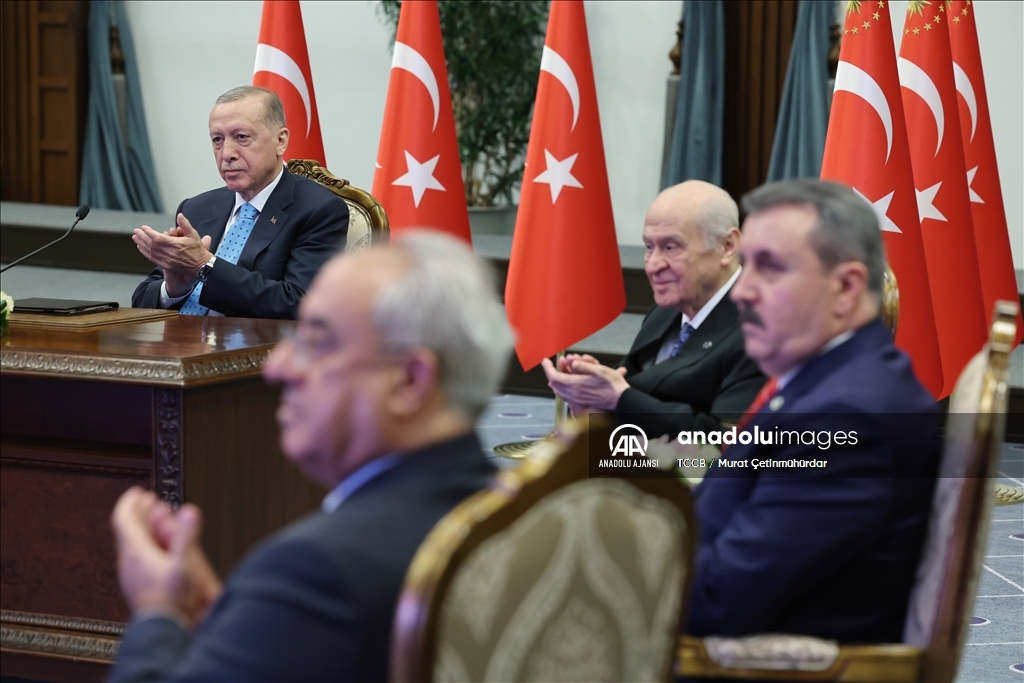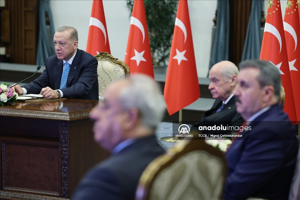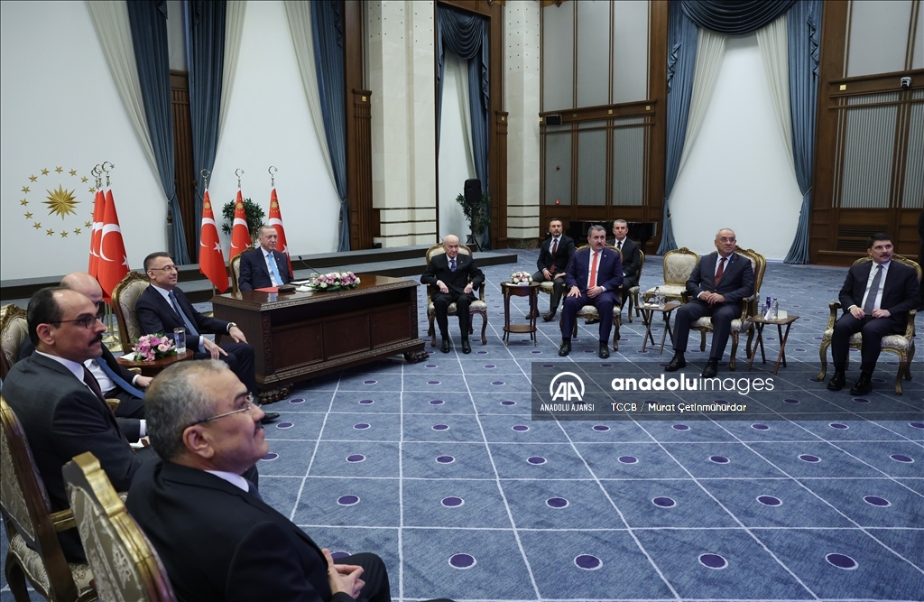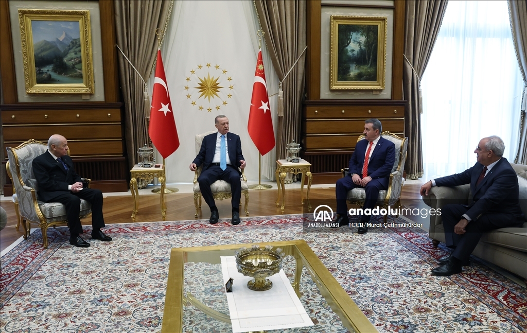 Cumhurbaşkanı Recep Tayyip Erdoğan, Cumhurbaşkanlığı Külliyesi'nden Akkuyu Nükleer Güç Santrali İlk Nükleer Yakıt Getirme Töreni'ne canlı bağlantı ile katıldı. Cumhurbaşkanı Erdoğan toplantının ardından MHP Genel Başkanı Devlet Bahçeli, Büyük Birlik Partisi Genel Başkanı Mustafa Destici ve Demokratik Sol Parti (DSP) Genel Başkanı Önder Aksakal ile bir araya geldi. ( TCCB/Murat Çetinmühürdar - Anadolu Ajansı )TCCB/Murat Çetinmühürdar