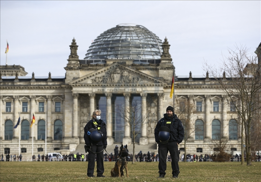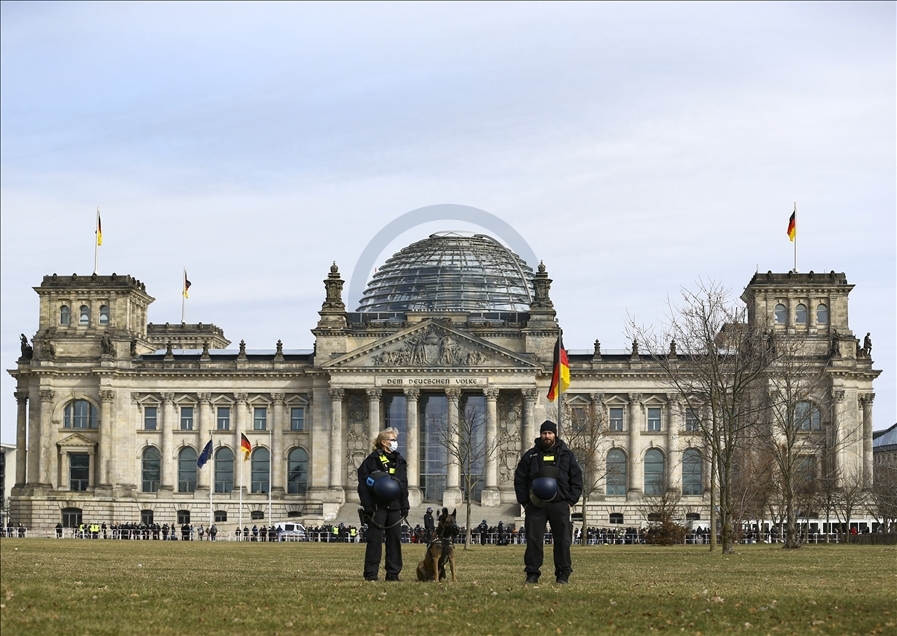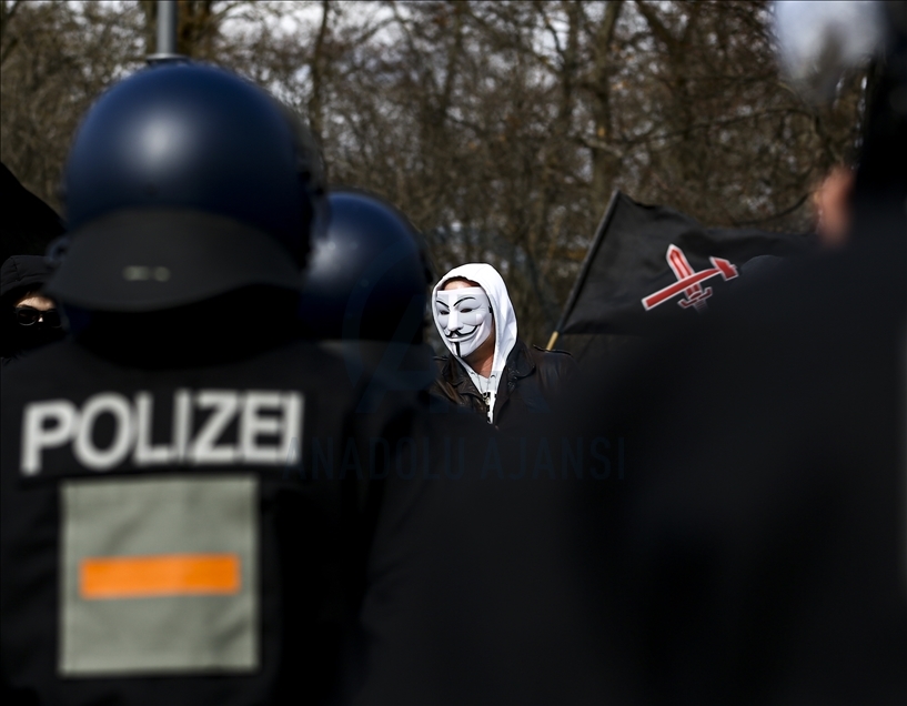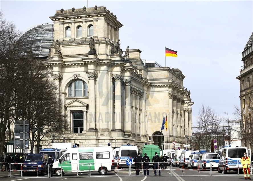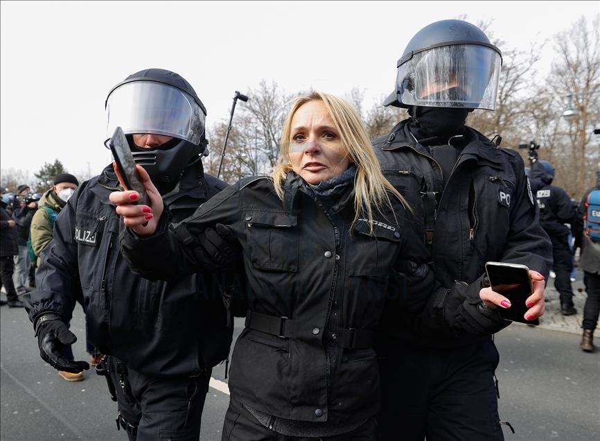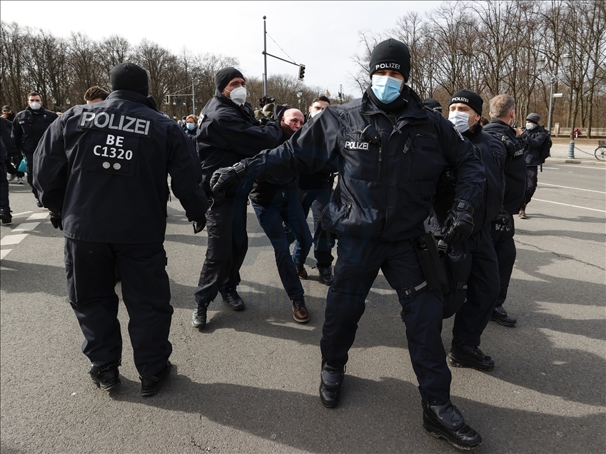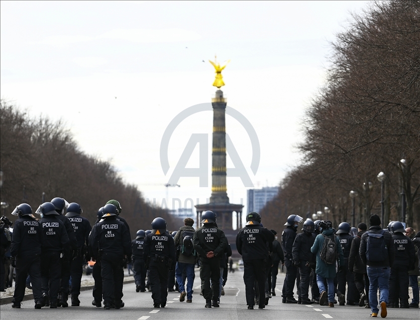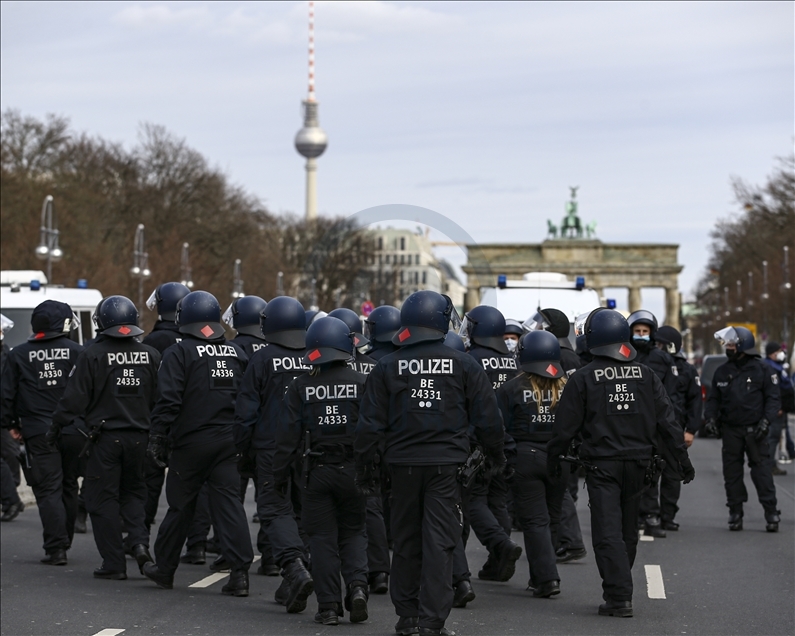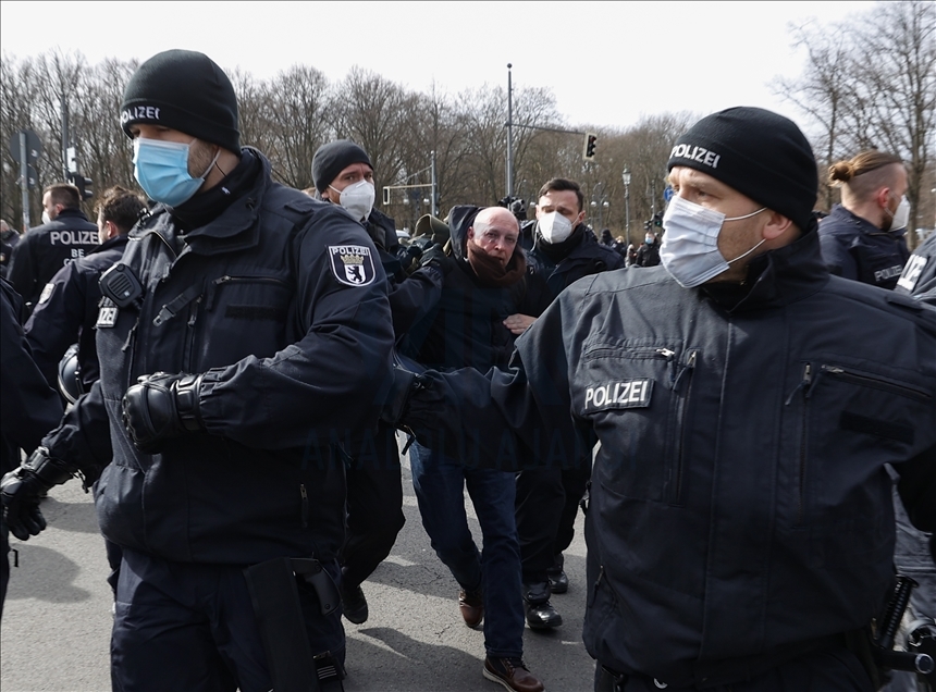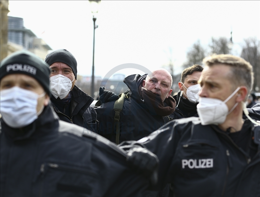 Almanya’nın Kassel kentinde hükümetin yeni tip koronavirüs (Kovid-19) salgınının yayılmasını önlemek için aldığı önlemlerini protesto gösterilerinde çok sayıda kişi gözaltına alındı. Kent merkezindeki Brandenburg Kapısı'nın önünde toplanan 200 kişi yoğun güvenlik önlemlerinin alandan Federal Meclise doğru yürüyüşe geçti. Polis, maske ve mesafe kurallarına uyulmadığı gerekçesiyle eylemi sonlandırdı. Göstericiler daha sonra polis eşliğinde alandan çıkarıldı. ( Abdulhamid Hoşbaş - Anadolu Ajansı )Abdulhamid Hoşbaş