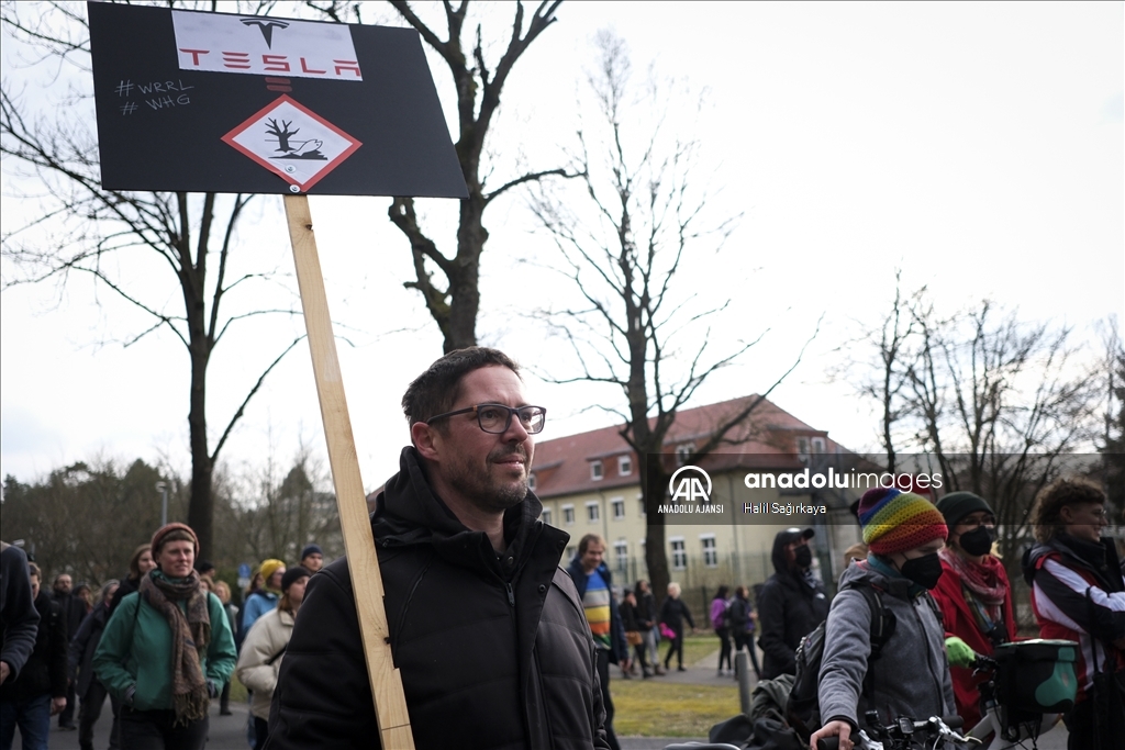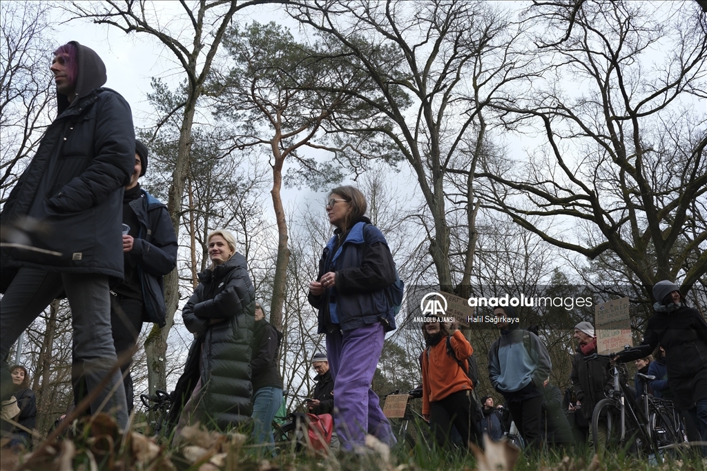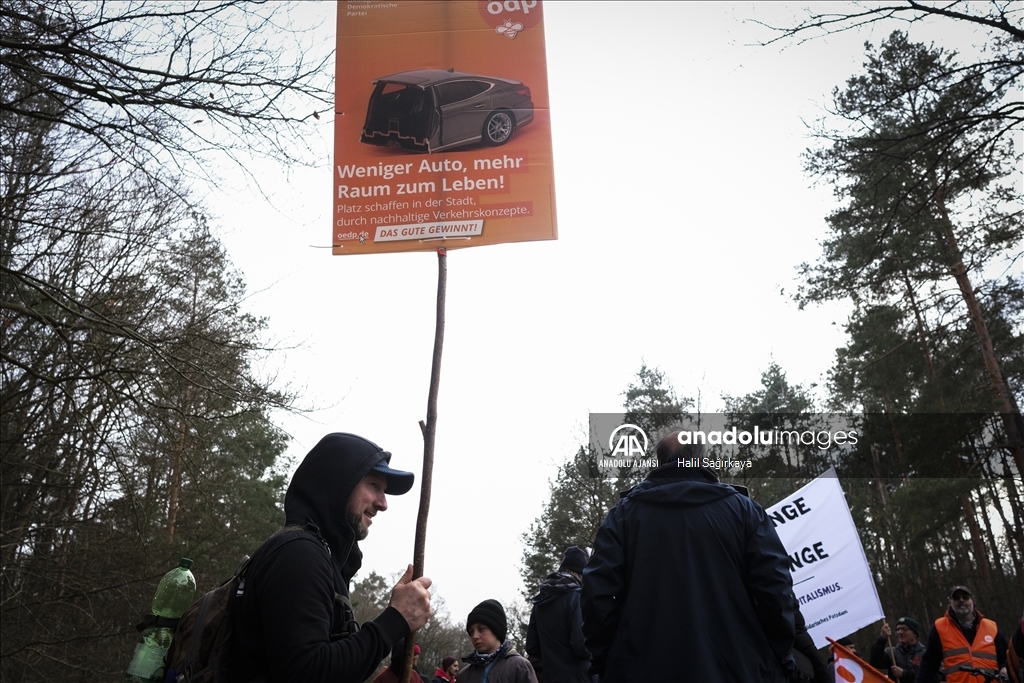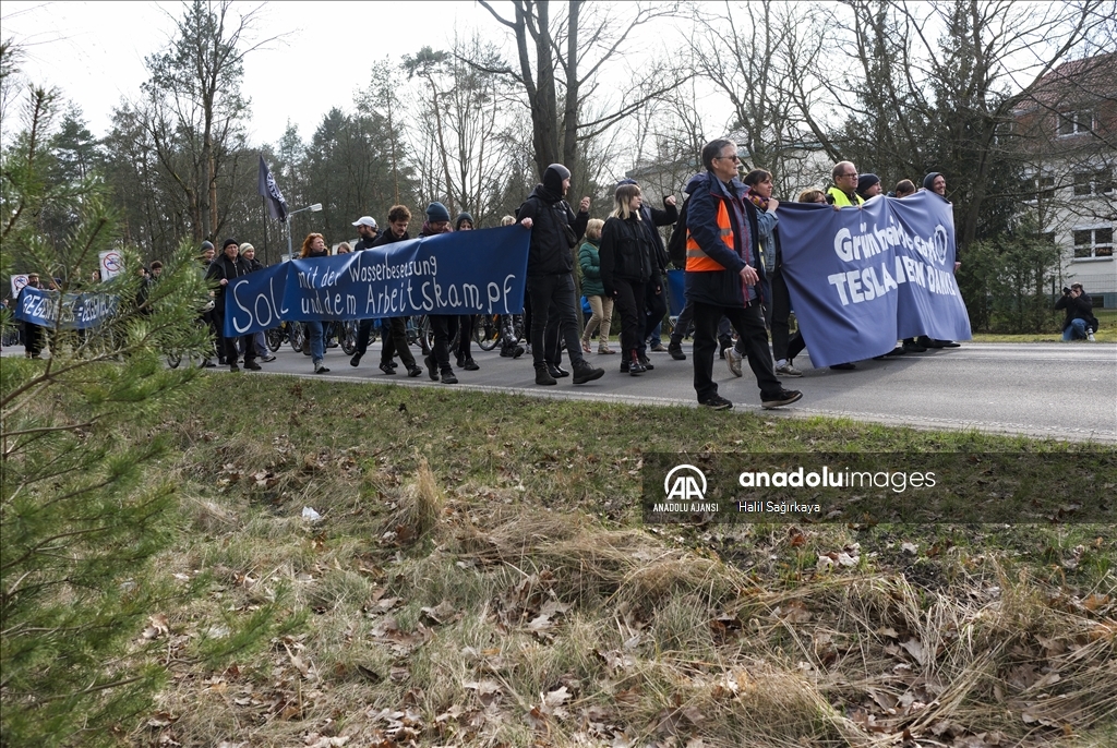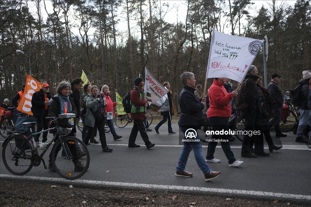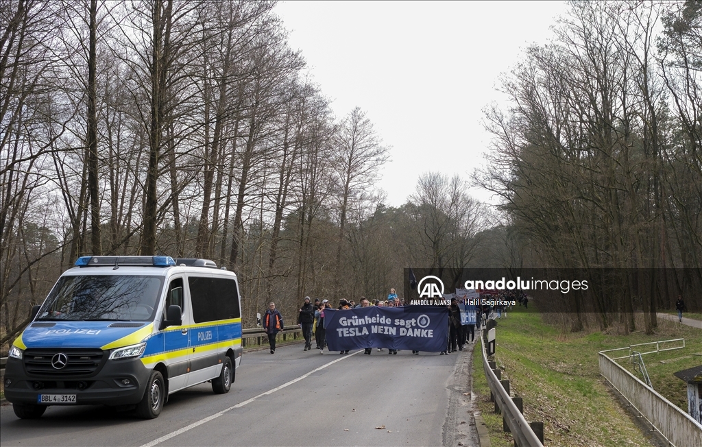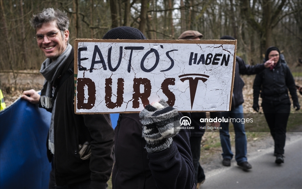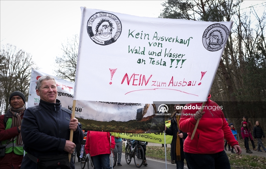 ABD merkezli elektrikli otomobil üreticisi Tesla'nın, Berlin yakınlarındaki Grünheide de bulunan fabrikasını genişletme planı protesto edildi. Tesla fabrikasının yakınlarındaki tren istasyonunda toplanan yüzlerce kişi, sloganlar atarak fabrikanın etrafındaki ormanlık alanda yürüdü. ( Halil Sağırkaya - Anadolu Ajansı )Halil Sağırkaya