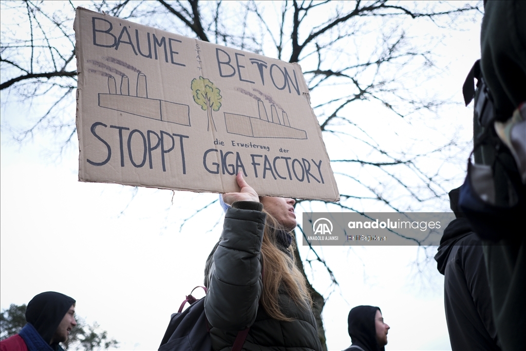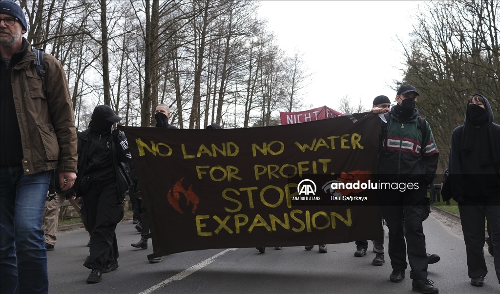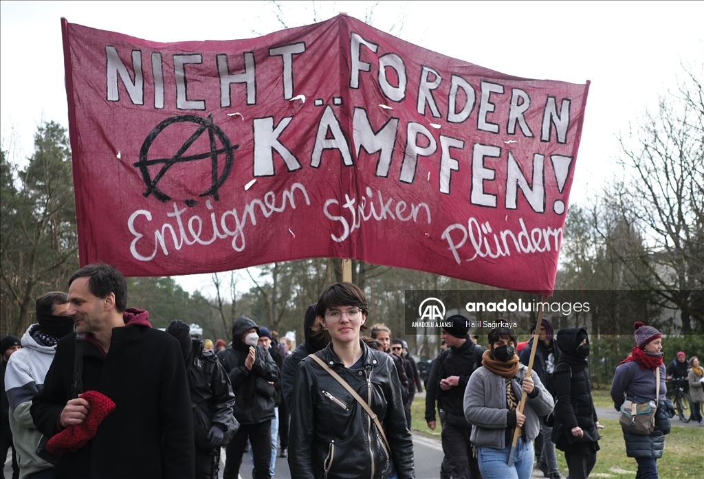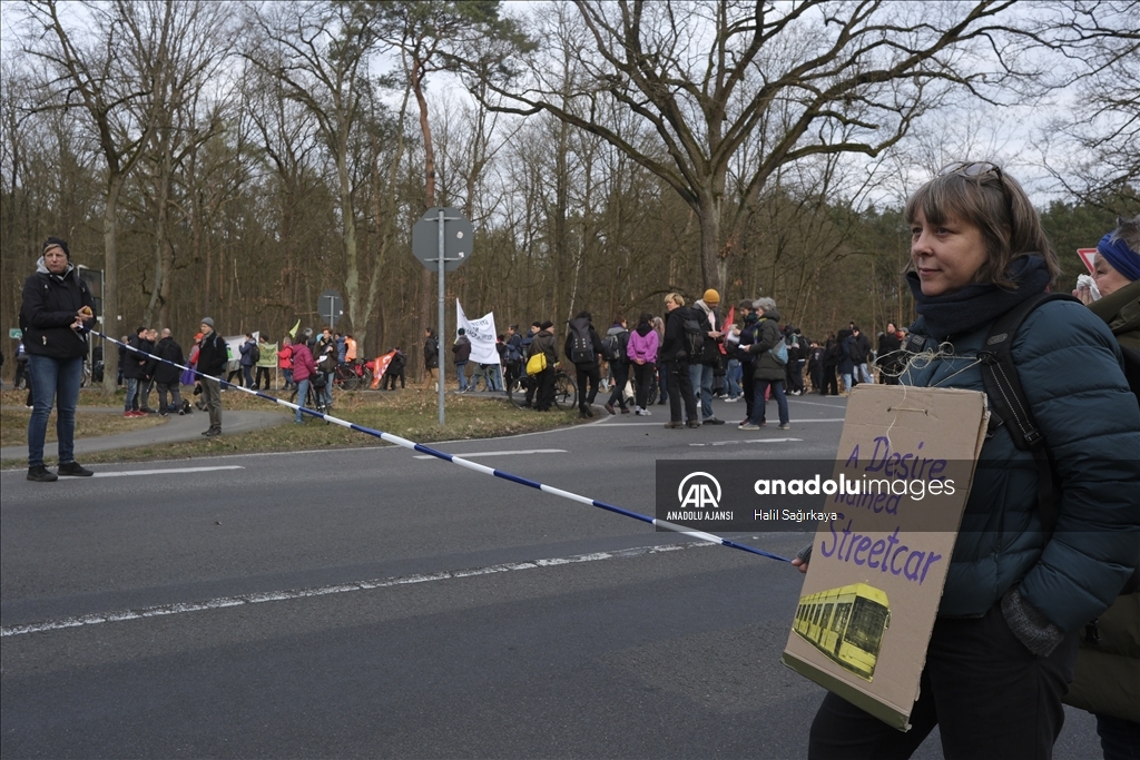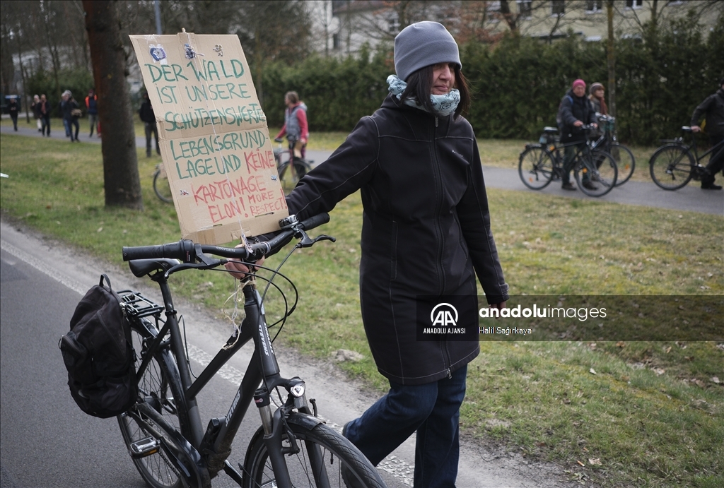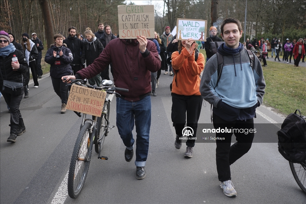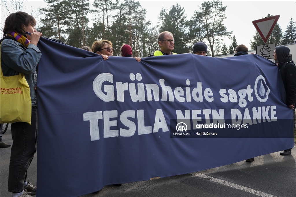ABD merkezli elektrikli otomobil üreticisi Tesla'nın, Berlin yakınlarındaki Grünheide de bulunan fabrikasını genişletme planı protesto edildi. Tesla fabrikasının yakınlarındaki tren istasyonunda toplanan yüzlerce kişi, sloganlar atarak fabrikanın etrafındaki ormanlık alanda yürüdü. ( Halil Sağırkaya - Anadolu Ajansı )Halil Sağırkaya