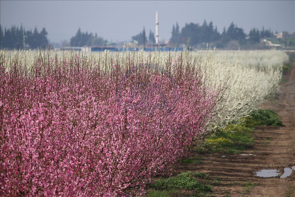 Hatay'da bir süredir etkili olan yağışların ardından güneşin kendisini göstermesiyle ağaçlar çiçek açtı. Bölgenin bereketli topraklarıyla ünlü Amik Ovası'ndaki meyve ağaçlarının çiçek açmasıyla güzel görüntü oluştu.