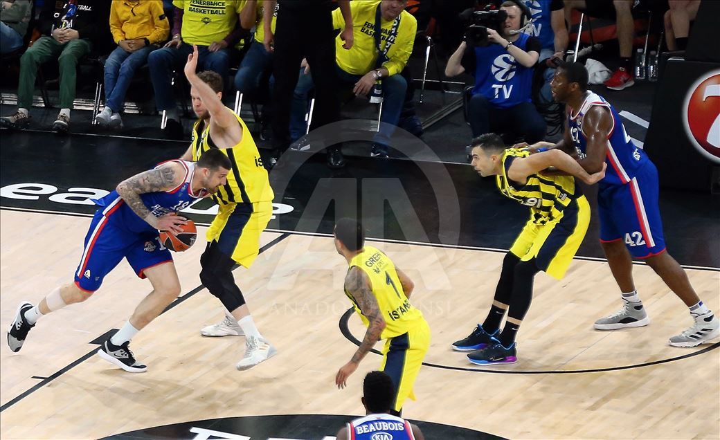 Türk Hava Yolları (THY) Avrupa Ligi Dörtlü Final turnuvası yarı final maçında, Fenerbahçe Beko ile Anadolu Efes takımları İspanya’nın Vitoria-Gasteiz kentindeki Fernando Buesa Arena'da karşılaştı. Karşılaşmada, Anadolu Efes takımının basketbolcusu Bryant Dunston (solda), rakibi Ahmet Düverioğlu (sağda) ile mücadele etti.