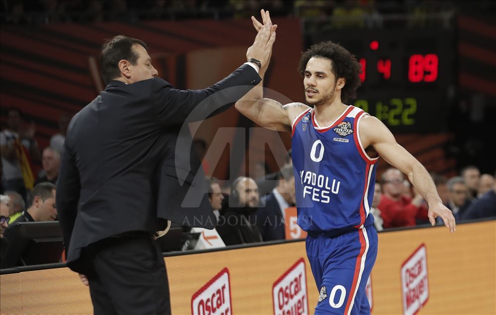 Türk Hava Yolları (THY) Avrupa Ligi Dörtlü Final turnuvası yarı final maçında, Fenerbahçe Beko ile Anadolu Efes takımları İspanya’nın Vitoria-Gasteiz kentindeki Fernando Buesa Arena'da karşılaştı. Karşılaşmayı kazanan Anadolu Efesli basketbolcu Shane Larkin (sağda) ve takım başantrenörü Ergin Ataman (solda) sevinç yaşadı. ( Burak Akbulut - Anadolu Ajansı )Burak Akbulut