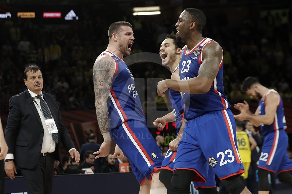 Türk Hava Yolları (THY) Avrupa Ligi Dörtlü Final turnuvası yarı final maçında, Fenerbahçe Beko ile Anadolu Efes takımları İspanya’nın Vitoria-Gasteiz kentindeki Fernando Buesa Arena'da karşılaştı. Karşılaşmayı kazanan Anadolu Efesli basketbolcular Shane Larkin (sol 3), James Anderson (sağ 2) ve Adrien Moerman (sol 2) sevinç yaşadı. ( Burak Akbulut - Anadolu Ajansı )Burak Akbulut