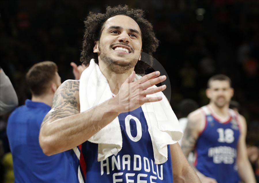 Türk Hava Yolları (THY) Avrupa Ligi Dörtlü Final turnuvası yarı final maçında, Fenerbahçe Beko ile Anadolu Efes takımları İspanya’nın Vitoria-Gasteiz kentindeki Fernando Buesa Arena'da karşılaştı. Karşılaşmayı kazanan Anadolu Efesli basketbolcu Shane Larkin (fotoğrafta) sevinç yaşadı. ( Burak Akbulut - Anadolu Ajansı )Burak Akbulut