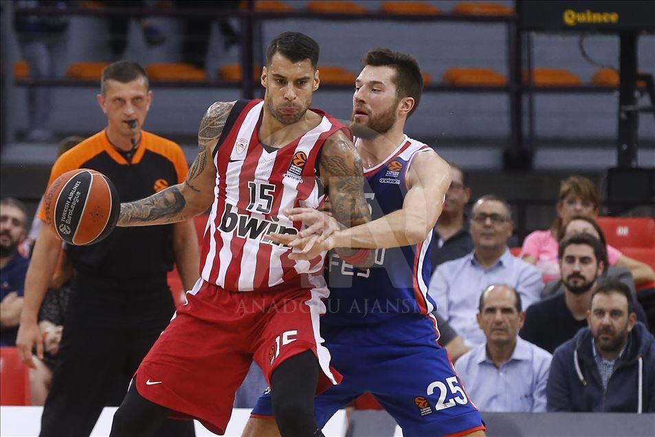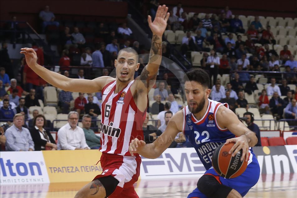 THY Avrupa Ligi 7. hafta maçında Olympiakos ile Anadolu Efes, başkent Atina'daki Barış ve Dostluk Stadı'nda karşılaştı. Bir pozisyonda Anadolu Efes takımından Vasilije Micic (sağda), rakibi ile mücadele etti. ( Ayhan Mehmet - Anadolu Ajansı )Ayhan Mehmet