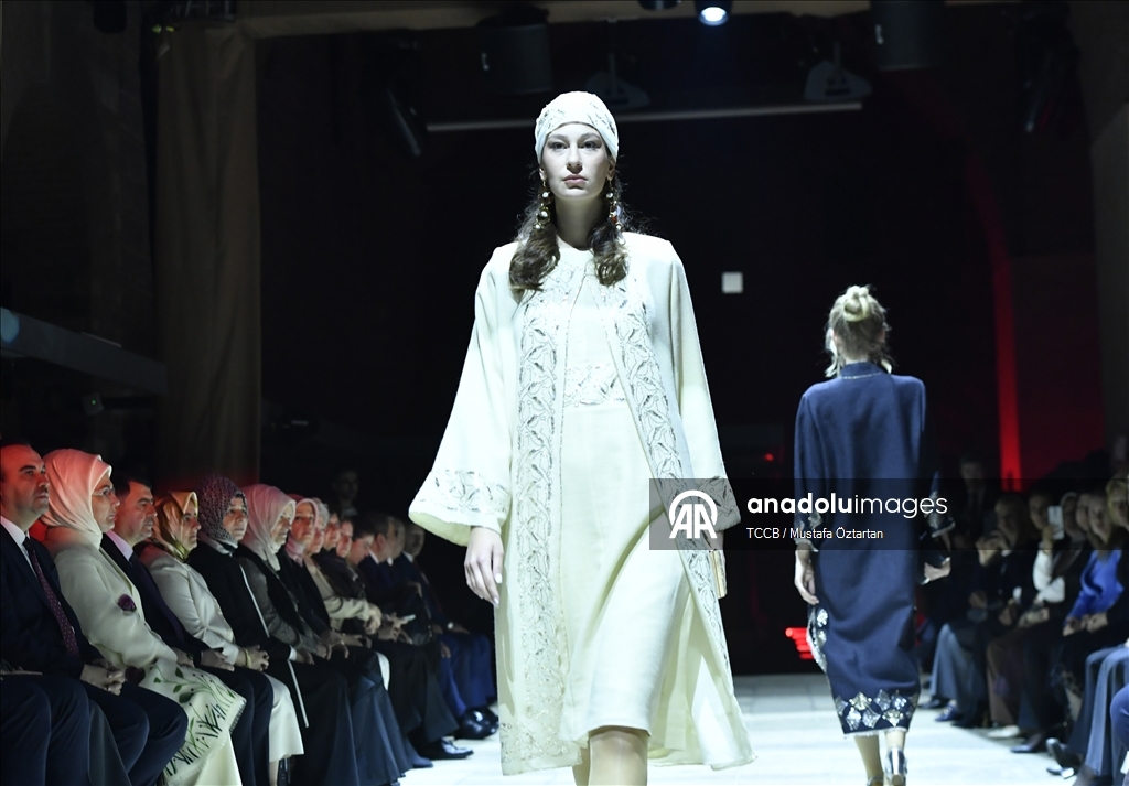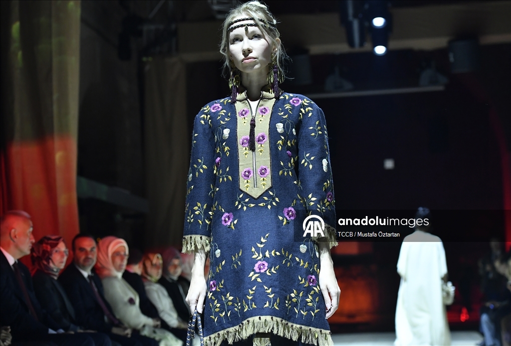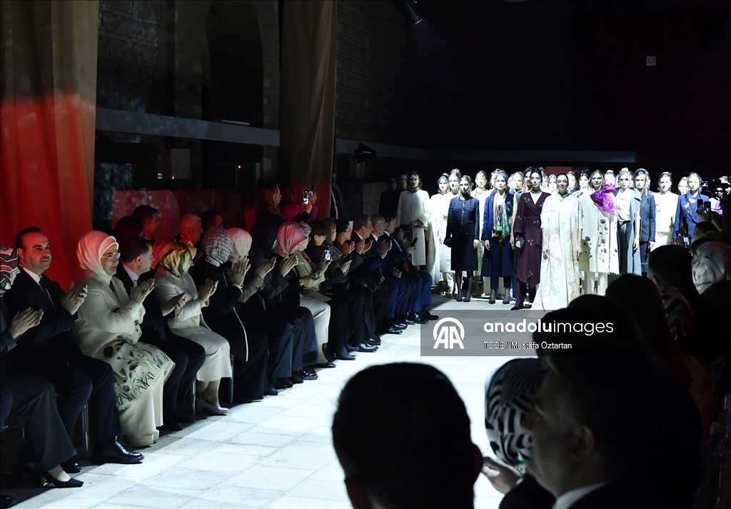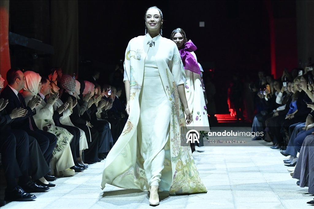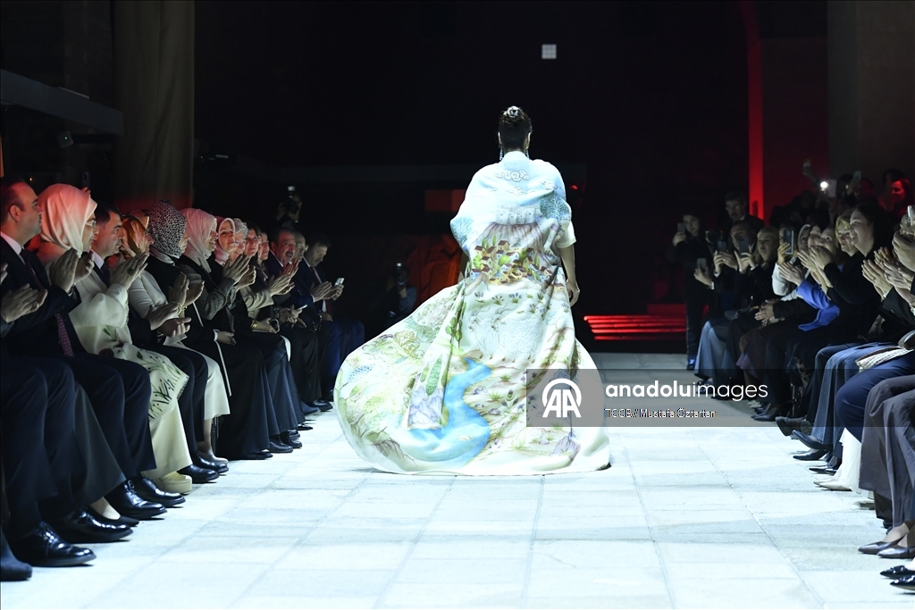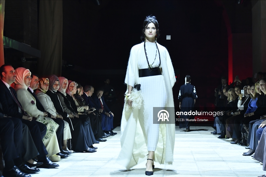 Konuşmaların sonrasında Erdoğan, sunuculuğunu Ebru Akel'in üstlendiği ve sof kumaşından 35 kıyafetin gösteriminin yer aldığı defileyi izledi.TCCB / Mustafa Öztartan