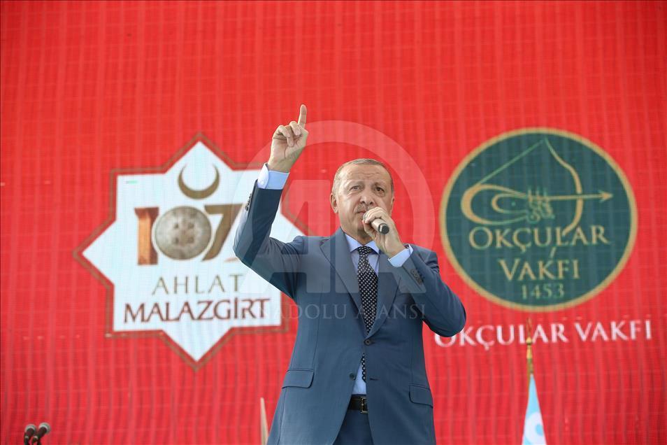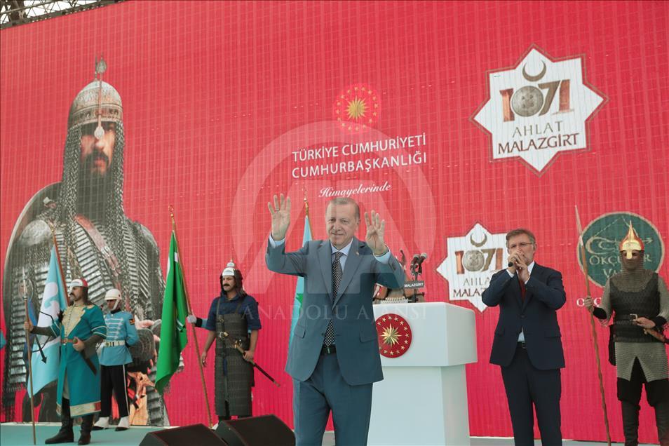 Türkiye Cumhurbaşkanı Recep Tayyip Erdoğan, Malazgirt'te gerçekleştirilen "Anadolu'nun Fethi Malazgirt 1071 Anma Programı"na katılarak bir konuşma yaptı. ( Cumhurbaşkanlığı/Murat Çetinmühürdar - Anadolu Ajansı )Cumhurbaşkanlığı/Murat Çetinmühürdar