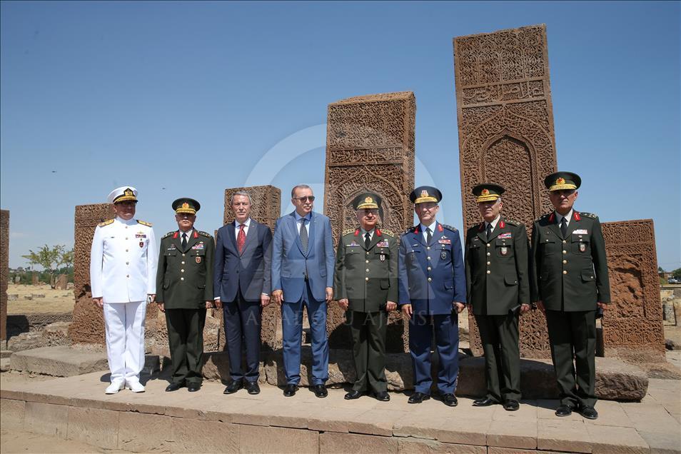 Cumhurbaşkanı Recep Tayyip Erdoğan, Malazgirt Zaferi'nin 947. yıl dönümü kutlama programı kapsamında Bitlis'in Ahlat ilçesindeki Selçuklu Meydan Mezarlığı'nı ziyaret etti. Cumhurbaşkanı Erdoğan'a Milli Savunma Bakanı Hulusi Akar (sol 3) ve kuvvet komutanları eşlik etti. ( Özkan Bilgin - Anadolu Ajansı )Özkan Bilgin