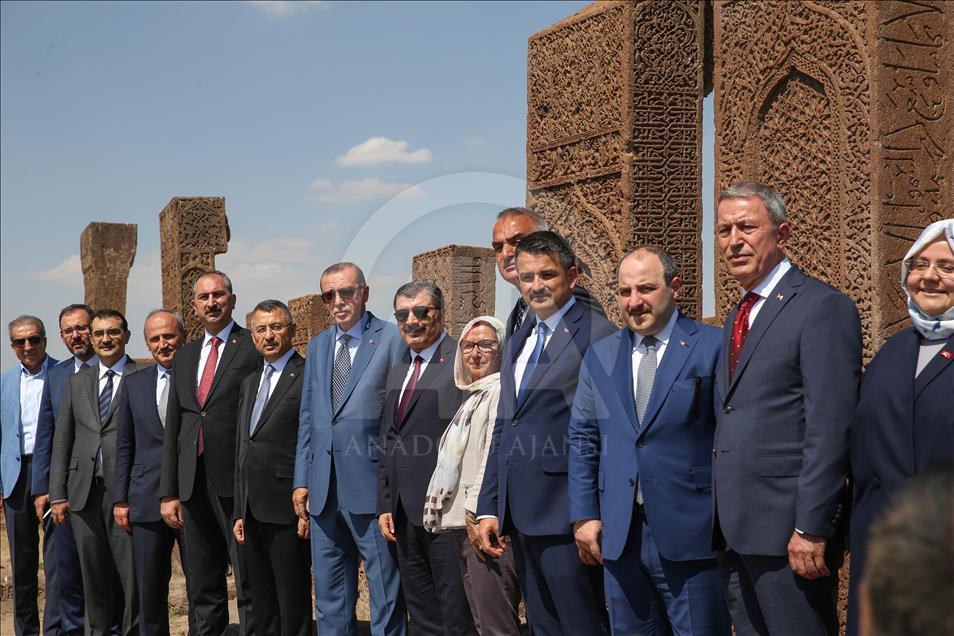 Cumhurbaşkanı Recep Tayyip Erdoğan, Malazgirt Zaferi'nin 947. yıl dönümü kutlama programı kapsamında Bitlis'in Ahlat ilçesindeki Selçuklu Meydan Mezarlığı'nı ziyaret etti. Cumhurbaşkanı Erdoğan'a Cumhurbaşkanı Yardımcısı Fuat Oktay, Milli Eğitim Bakanı Ziya Selçuk, İçişleri Bakanı Süleyman Soylu, Çalışma, Sosyal Hizmetler ve Aile Bakanı Zehra Zümrüt Selçuk, Sağlık Bakanı Fahrettin Koca, Gençlik ve Spor Bakanı Mehmet Kasapoğlu, Milli Savunma Bakanı Hulusi Akar, Sanayi ve Teknoloji Bakanı Mustafa Varank, Adalet Bakanı Abdulhamit Gül, Enerji ve Tabii Kaynaklar Bakanı Fatih Dönmez, Kültür ve Turizm Bakanı Mehmet Ersoy, Ticaret Bakanı Ruhsar Pekcan, Tarım ve Orman Bakanı Bekir Pakdemirli ve Ulaştırma ve Altyapı Bakanı Mehmet Cahit Turhan da eşlik etti. ( Özkan Bilgin - Anadolu Ajansı )Özkan Bilgin