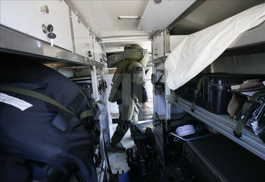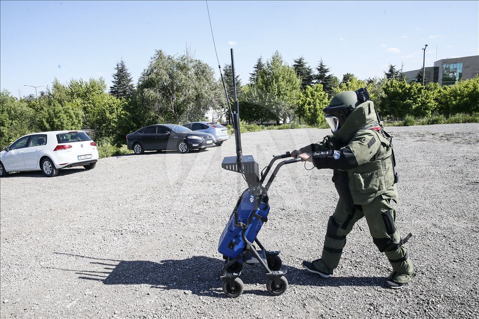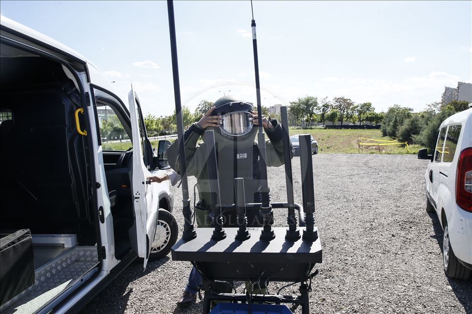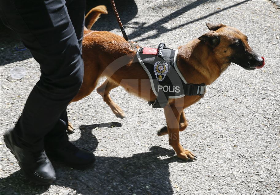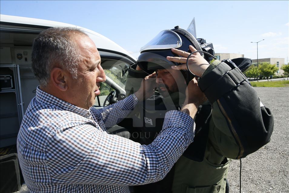 Ankara Emniyet Müdürlüğü Bomba İmha ve İnceleme Şube Müdürlüğü bünyesinde görev alan 8 dedektör bomba arama köpeği, başkentlilerin güvenliği için bomba uzmanı eğiticileriyle 24 saat mesai yapıyor. Ankara Bomba İmha ve İnceleme Şube Müdürlüğü ekiplerince, bomba dedektörü köpeklerinden katılımıyla yapılan tatbikatı AA kameraları görüntüledi. Tatbikat kapsamında olay yerinde hazır bekleyen ekipte bulunan bomba uzmanı, şüpheli araca yaklaşmadan önce büyük bir hassasiyetle kurup çalıştırdığı sinyal kesici cihazı da yanına alarak, giydiği koruyucu elbiseyle bombaya müdahale edip etkisiz hale getirdi. ( Doğukan Keskinkılıç - Anadolu Ajansı )Doğukan Keskinkılıç