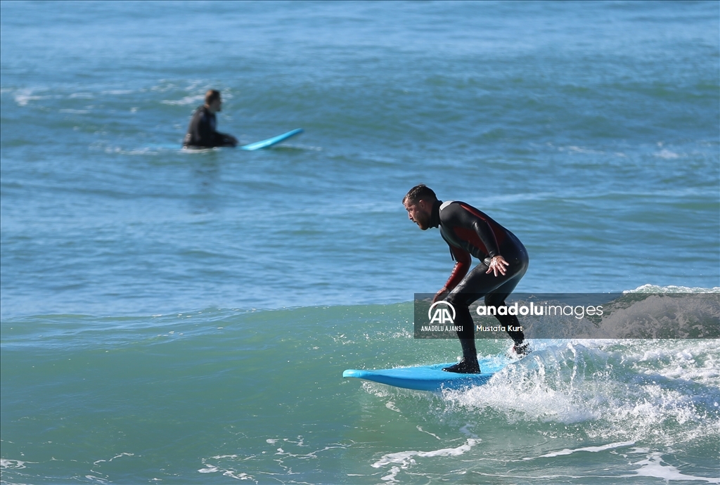 Türkiye genelinde soğuk hava etkili olurken, Antalya'nın Alanya ilçesinde bir grup sporcu sörf yaptı.