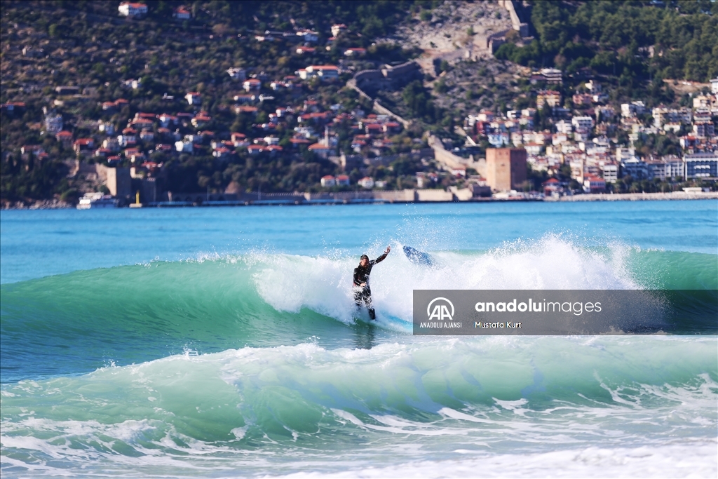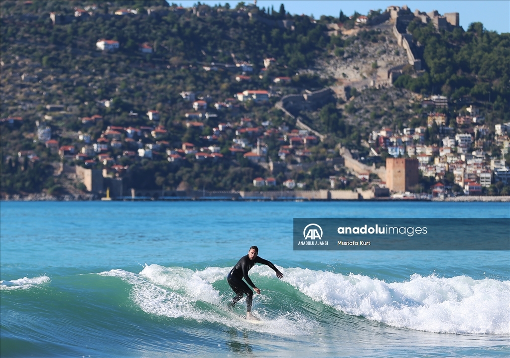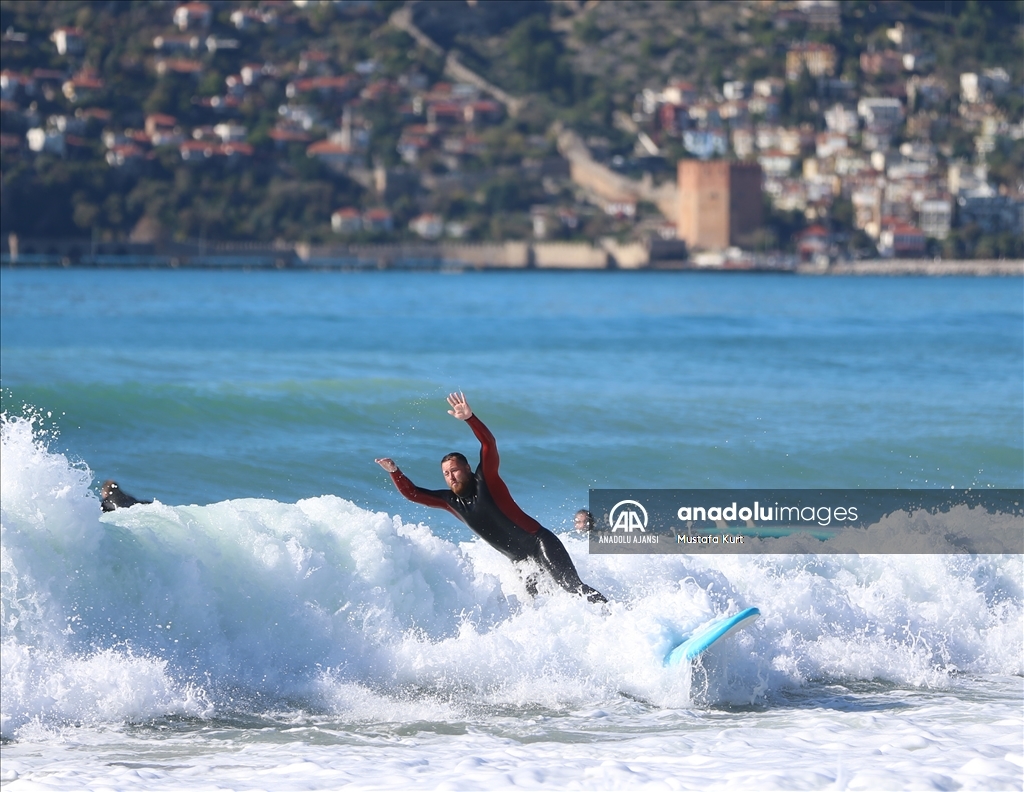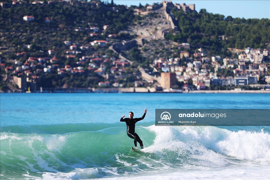 Türkiye genelinde soğuk hava etkili olurken, Antalya'nın Alanya ilçesinde bir grup sporcu sörf yaptı. ( Mustafa Kurt - Anadolu Ajansı )
