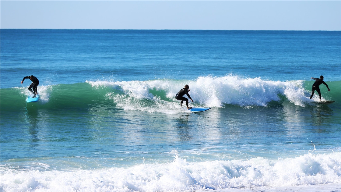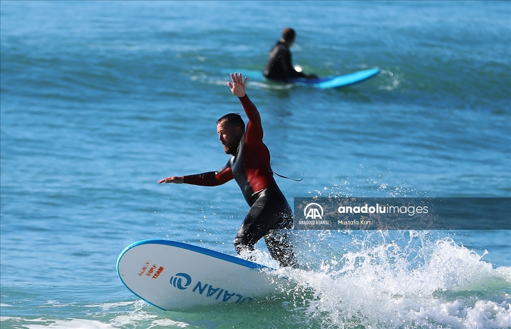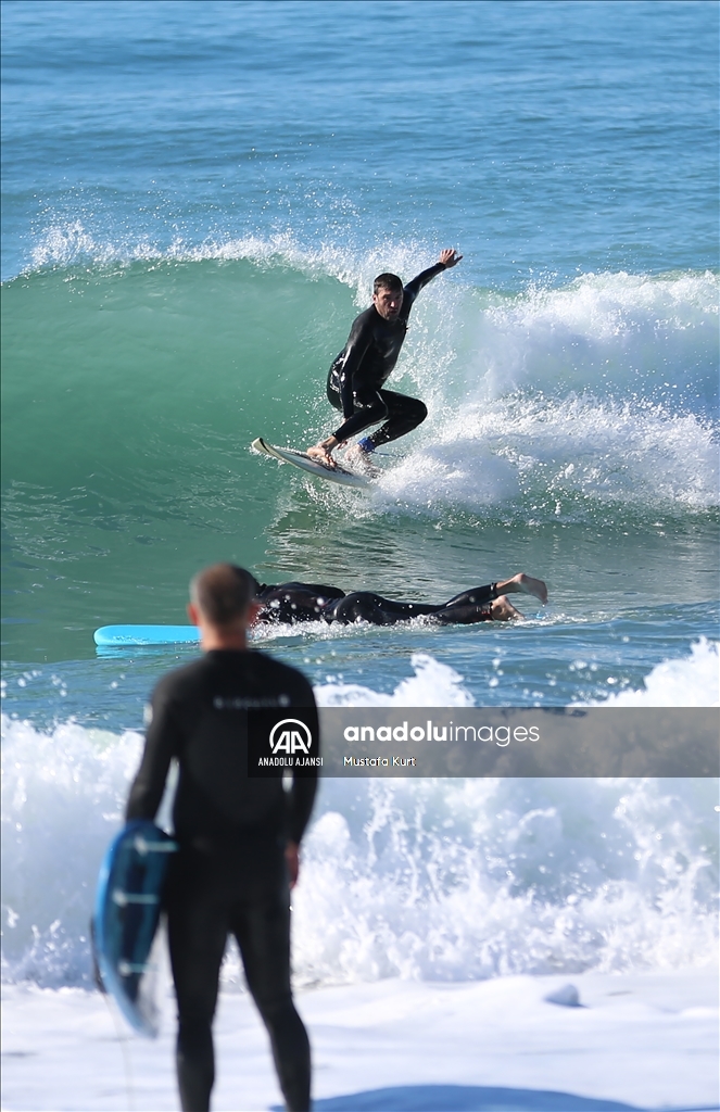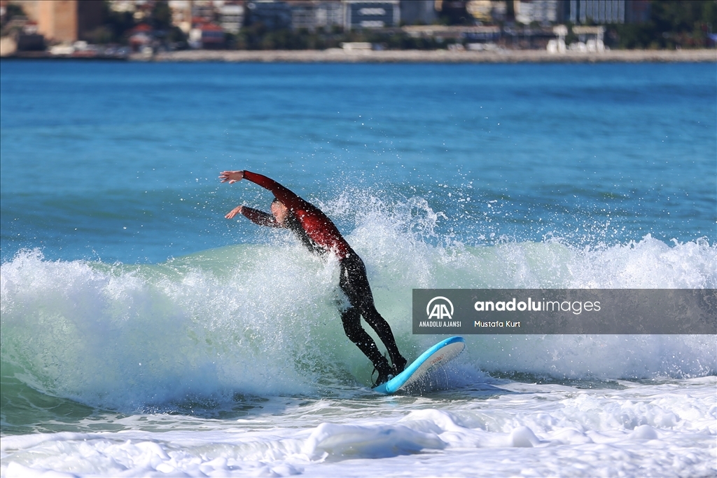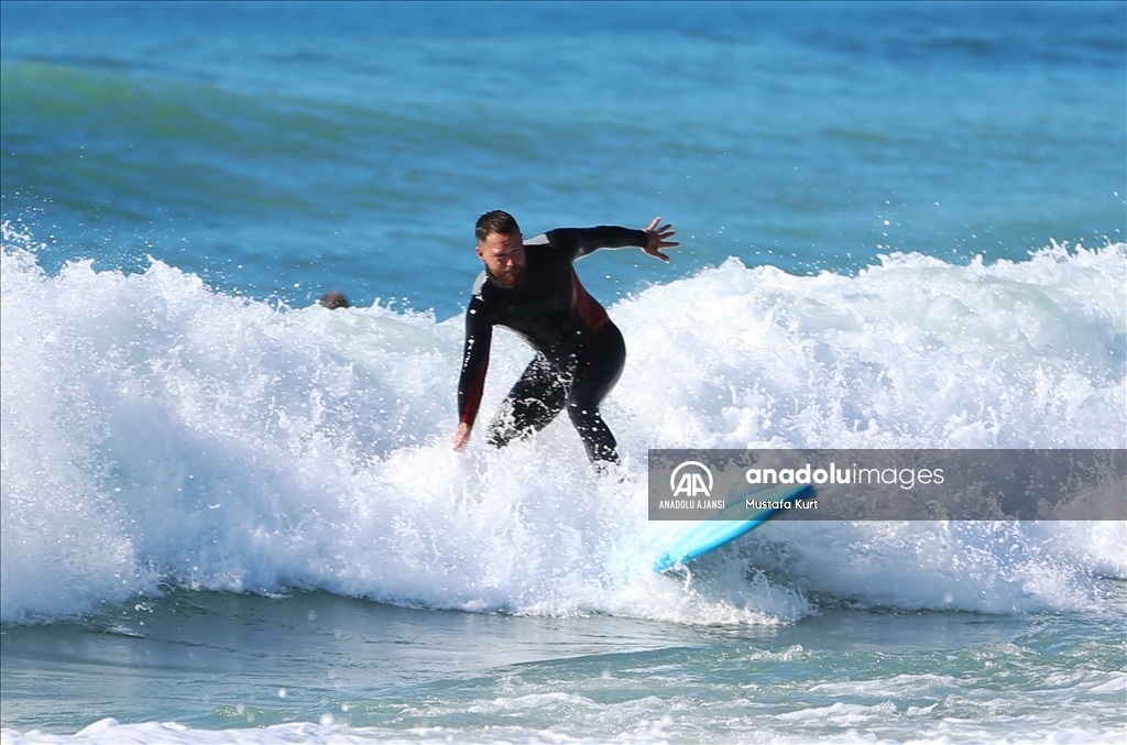 Türkiye genelinde soğuk hava etkili olurken, Antalya'nın Alanya ilçesinde bir grup sporcu sörf yaptı. ( Mustafa Kurt - Anadolu Ajansı )