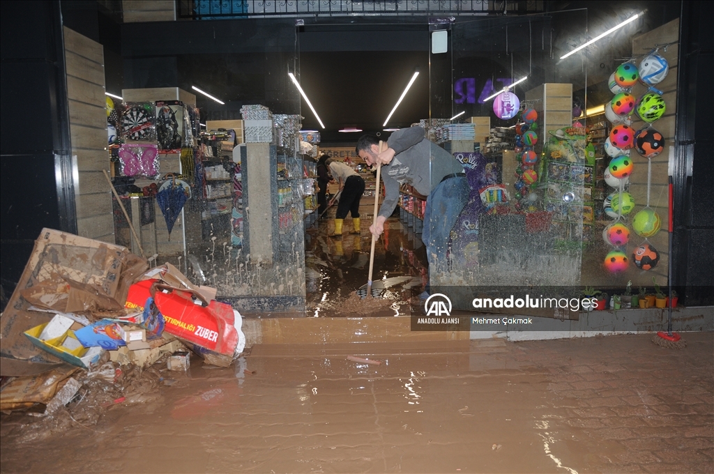 Antalya'nın Kumluca ilçesinde kuvvetli yağışın ardından derelerin taşması sonucu çok sayıda ev ve iş yerini su bastı. Bazı vatandaşlar iş yerlerinin önünü temizledi. ( Hatice Özdemir Tosun - Anadolu Ajansı )Hatice Özdemir Tosun
