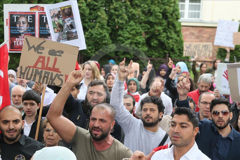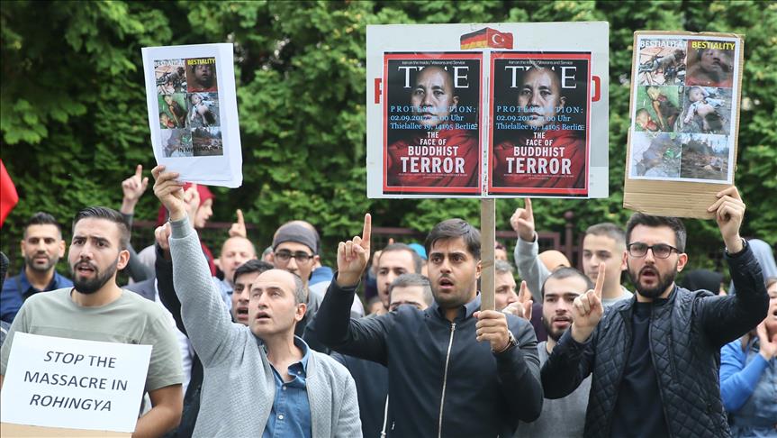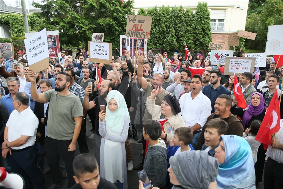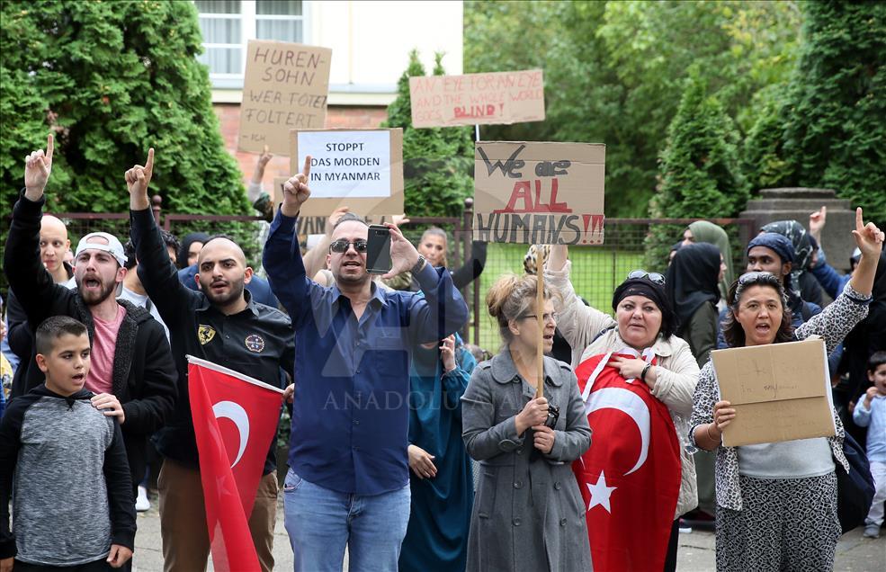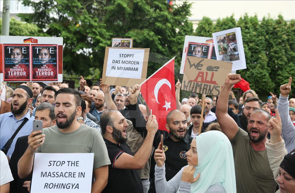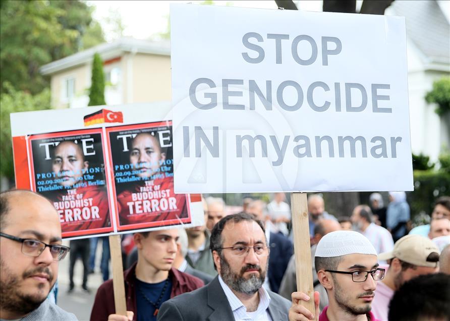 Arakan’daki Müslümanlara uygulanan katliam Almanya’nın başkenti Berlin’deki Myanmar Büyükelçiliği önünde protesto edildi. Berlin Türk Cemaati'nin düzenlediği ve Berlin'de faaliyet gösteren sivil toplum kuruluşlarının destek verdiği protesto gösterisinde Türk bayrakları ile üzerinde Almanca ve İngilizce “Myanmar’daki soykırımı durdurun”, “Arakan'da Müslümanları öldürmeyi durdurun” ve “Katliamı durdurun” yazılı pankartlar taşındı. ( Cüneyt Karadağ - Anadolu Ajansı )Cüneyt Karadağ