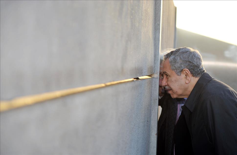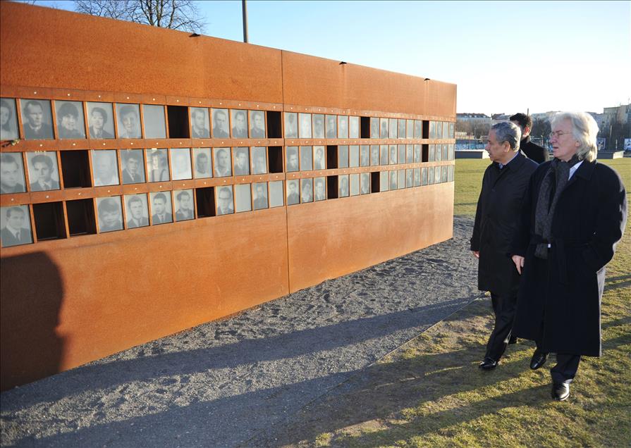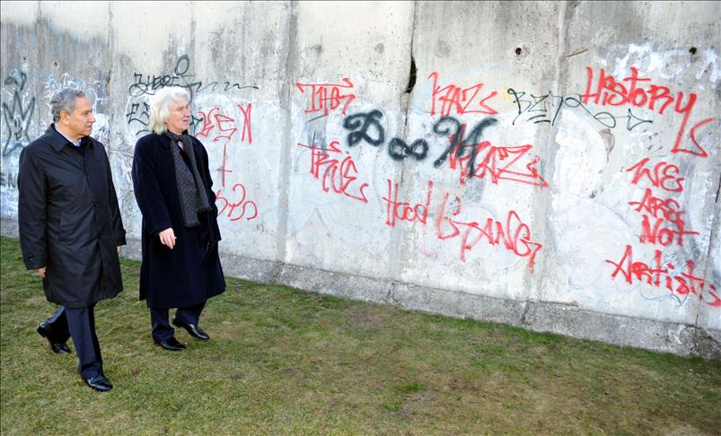 ALMANYA'DA BIR DIZI TEMASLARDA BULUNACAK OLAN BASBAKAN YARDIMCISI BULENT ARINC BERLIN'E GELDI. BULENT ARINC VE BUYUKELCI HUSEYIN AVNI KARSLIOGLU BERLIN'DEKI CHECK POINT CHARLIE MEVKIINDEKI BERLIN DUVARI KALINTILARINI INCELEDI. (ANADOLU AJANSI-CUNEYT KARADAG)(20130304)CUNEYT KARADAG