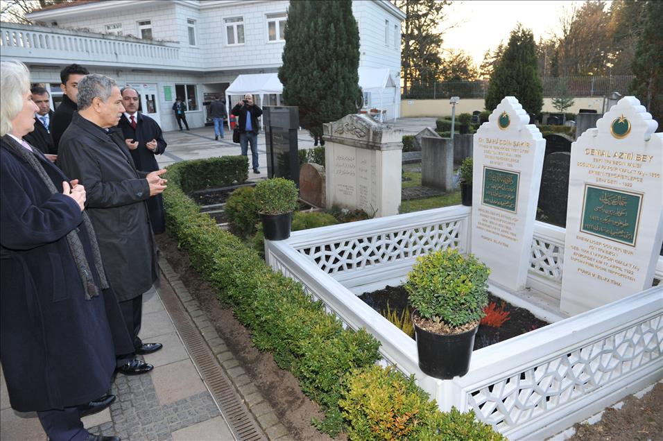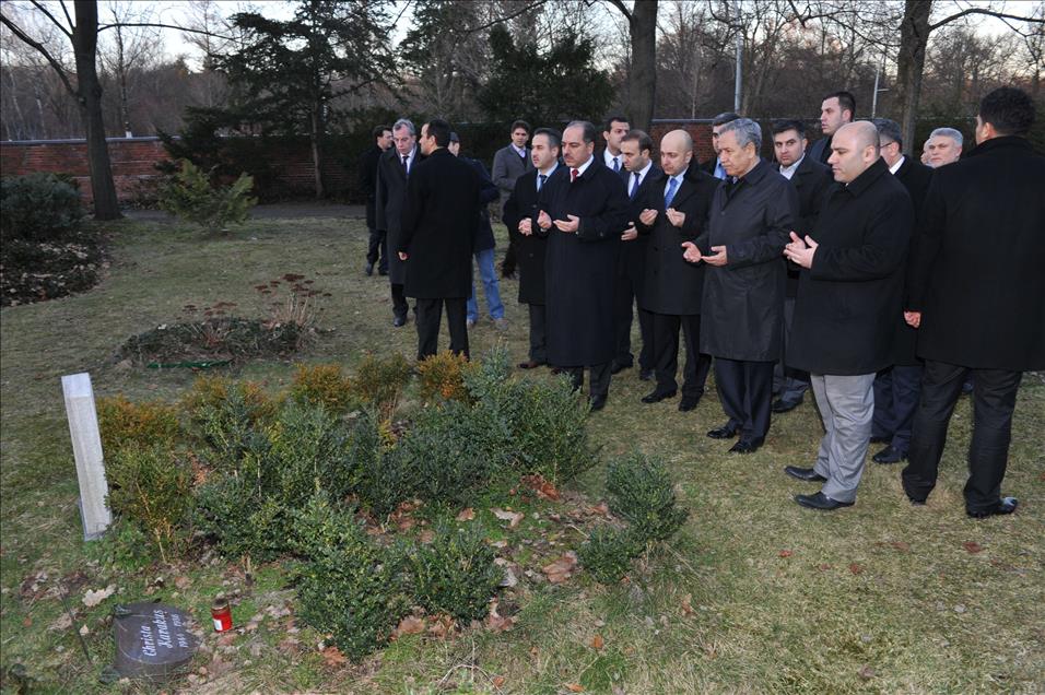 ALMANYA'DA BIR DIZI TEMASLARDA BULUNACAK OLAN BASBAKAN YARDIMCISI BULENT ARINC BERLIN'E GELDI. BULENT ARINC BERLIN'DEKI SEHITLIK CAMII BAHCESINDE BULUNAN MEZARLIKTA MEDFUN BULUNAN VE ERMENILER TARAFINDA SEHID EDILEN BAHADDIN SAKIR VE CEMAL AZMI BEY'IN KABRI BASINDA DUA ETTI. (ANADOLU AJANSI-CUNEYT KARADAG)(20130304)CUNEYT KARADAG
