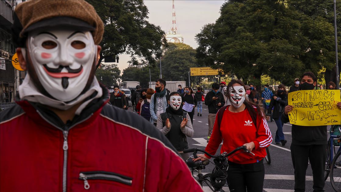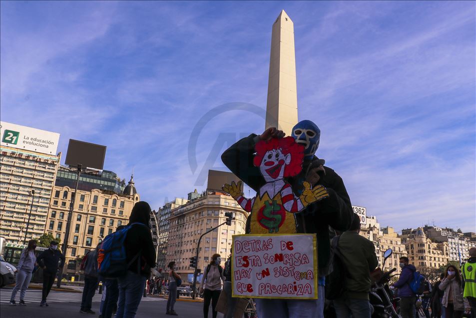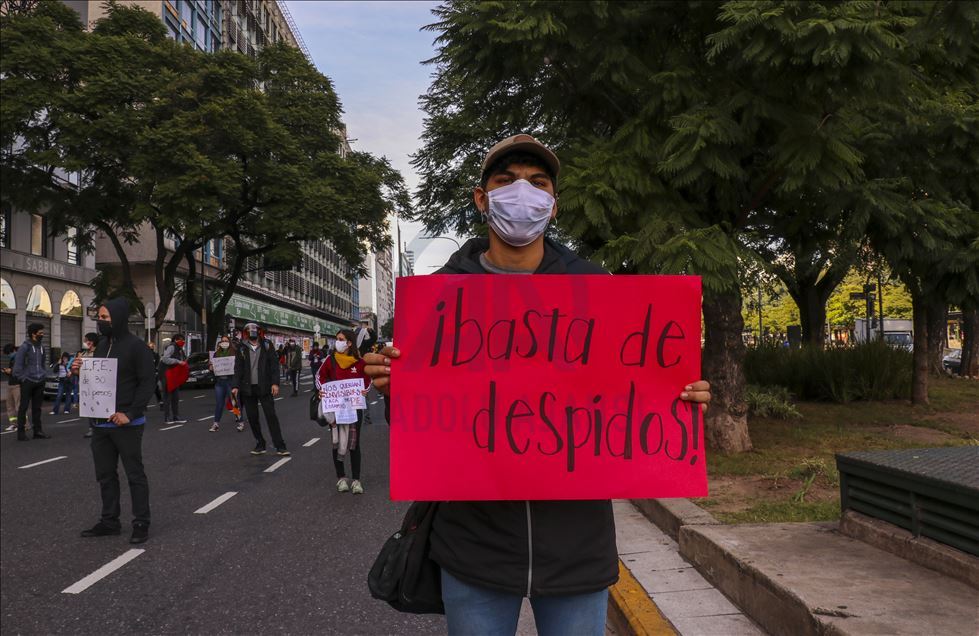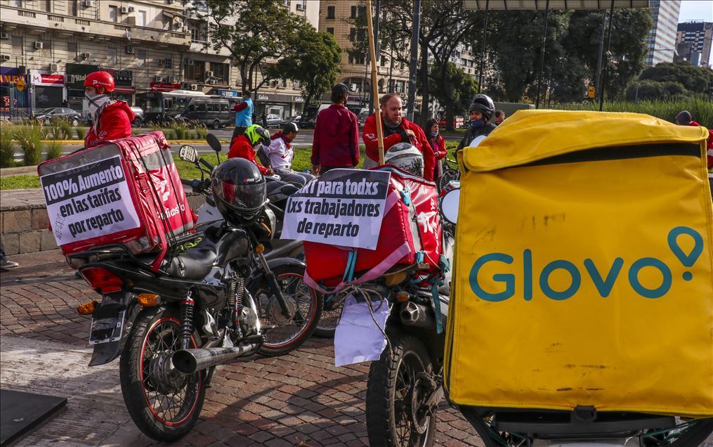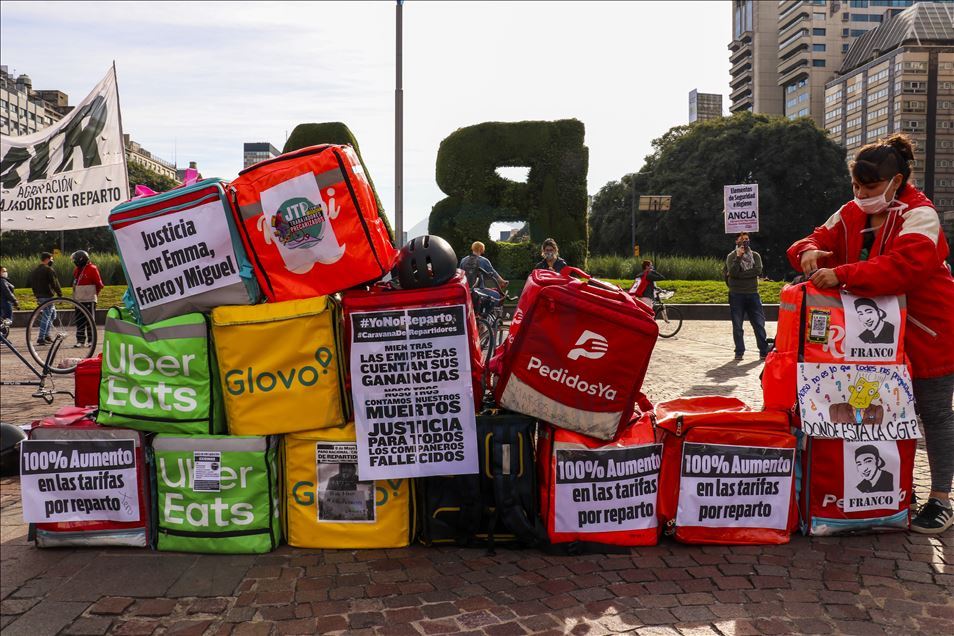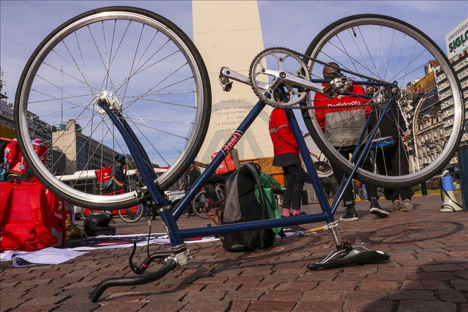 Arjantin'in başkenti Buenos Aires'te, mobil sipariş uygulamaları için çalışan kuryeler, yeni tip koronavirüs (Kovid-19) salgınıyla mücadele kapsamında uygulanan karantinaya rağmen gösteri düzenledi. Başkent Buenos Aires'in merkezindeki Obelisco Dikilitaşı yakınında, Kayıtdışı ve Serbest Çalışan Gençler Ulusal Ağı ile Dağıtım İşçileri Grubunun (ATR) çağrısıyla iş bırakan kuryeler, çalışma şartlarının iyileştirilmesi ve ücretlerin artırılması talebiyle eylem yaptı.