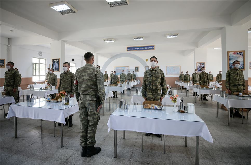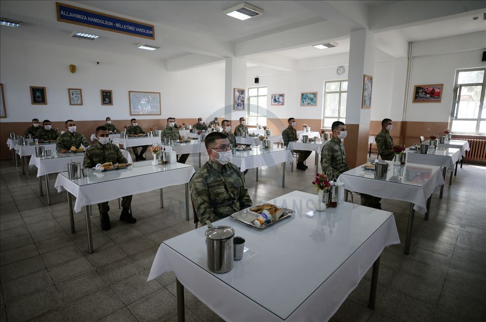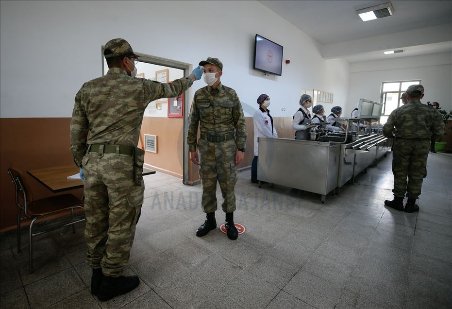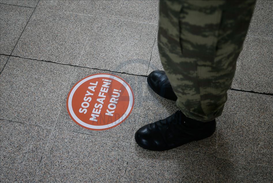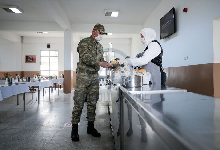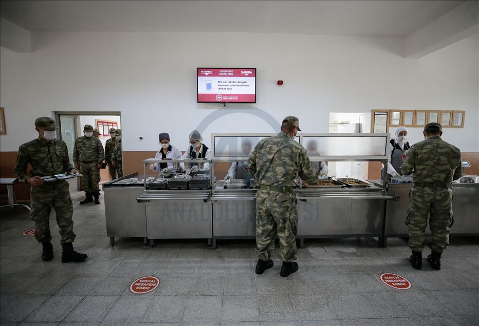 Ege Ordusu Komutanlığının İzmir'in Foça ilçesinde bulunan Ulaştırma ve Terminal Birlik Komutanlığında, yeni tip koronavirüse (Kovid-19) karşı askeri personel ve erlerin korunması, salgının yayılmaması için alınan tedbirler titizlikle uygulanıyor. Komutanlıkta koronavirüs tedbirleri kapsamında Mehmetçiğe ayrılan yemekhane bölümünde sosyal mesafe kuralına uyuluyor. ( Mahmut Serdar Alakuş - Anadolu Ajansı )Mahmut Serdar Alakuş