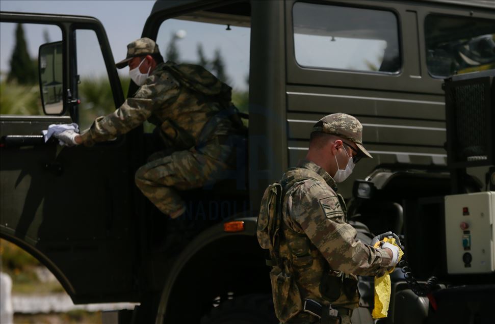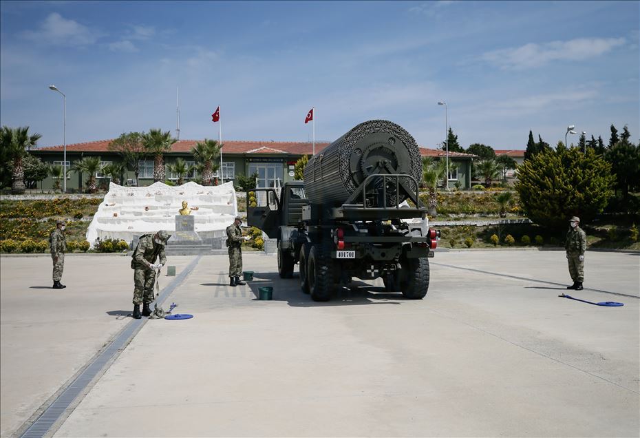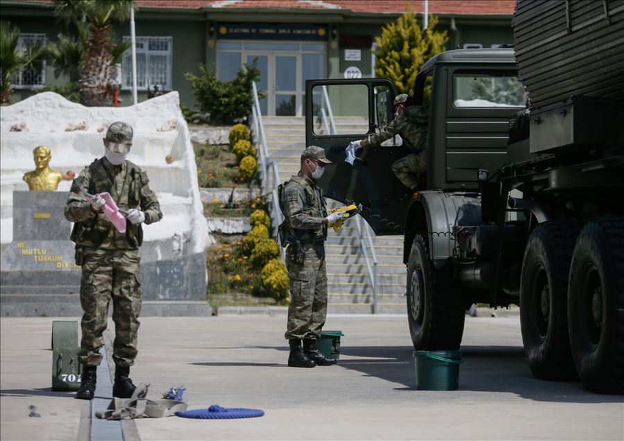 Ege Ordusu Komutanlığının İzmir'in Foça ilçesinde bulunan Ulaştırma ve Terminal Birlik Komutanlığında, yeni tip koronavirüse (Kovid-19) karşı askeri personel ve erlerin korunması, salgının yayılmaması için alınan tedbirler titizlikle uygulanıyor. Komutanlıkta koronavirüs tedbirleri kapsamında askeri araçlar ve personel araçları her kullanımdan önce ve sonra dezenfekte ediliyor. ( Mahmut Serdar Alakuş - Anadolu Ajansı )Mahmut Serdar Alakuş