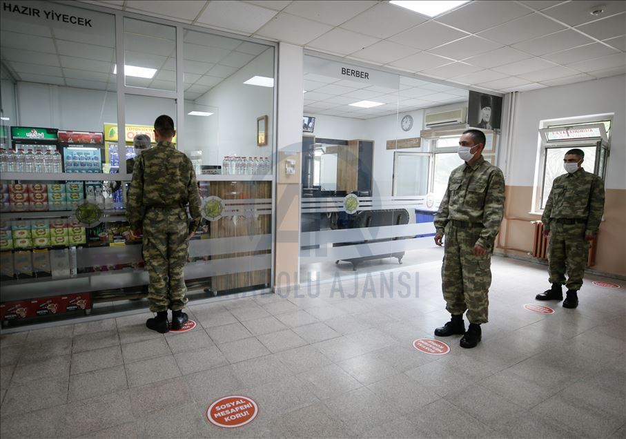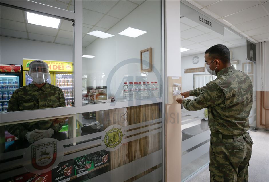 Ege Ordusu Komutanlığının İzmir'in Foça ilçesinde bulunan Ulaştırma ve Terminal Birlik Komutanlığında, yeni tip koronavirüse (Kovid-19) karşı askeri personel ve erlerin korunması, salgının yayılmaması için alınan tedbirler titizlikle uygulanıyor. Komutanlıkta koronavirüs tedbirleri kapsamında Mehmetçiğe ayrılan gazinoda sosyal mesafe korunarak el dezenfektanları kullanılmadan alışveriş yapılmıyor. ( Mahmut Serdar Alakuş - Anadolu Ajansı )Mahmut Serdar Alakuş