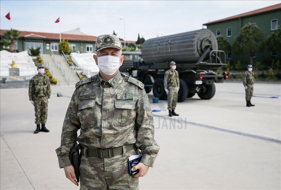 Ege Ordusu Komutanlığının İzmir'in Foça ilçesinde bulunan Ulaştırma ve Terminal Birlik Komutanlığında, yeni tip koronavirüse (Kovid-19) karşı askeri personel ve erlerin korunması, salgının yayılmaması için alınan tedbirler titizlikle uygulanıyor. Salgınla Mücadele Kurulu Başkanı Ulaştırma Binbaşı Tarık Kılıç, gazetecilere açıklamalarda bulundu. ( Mahmut Serdar Alakuş - Anadolu Ajansı )Mahmut Serdar Alakuş